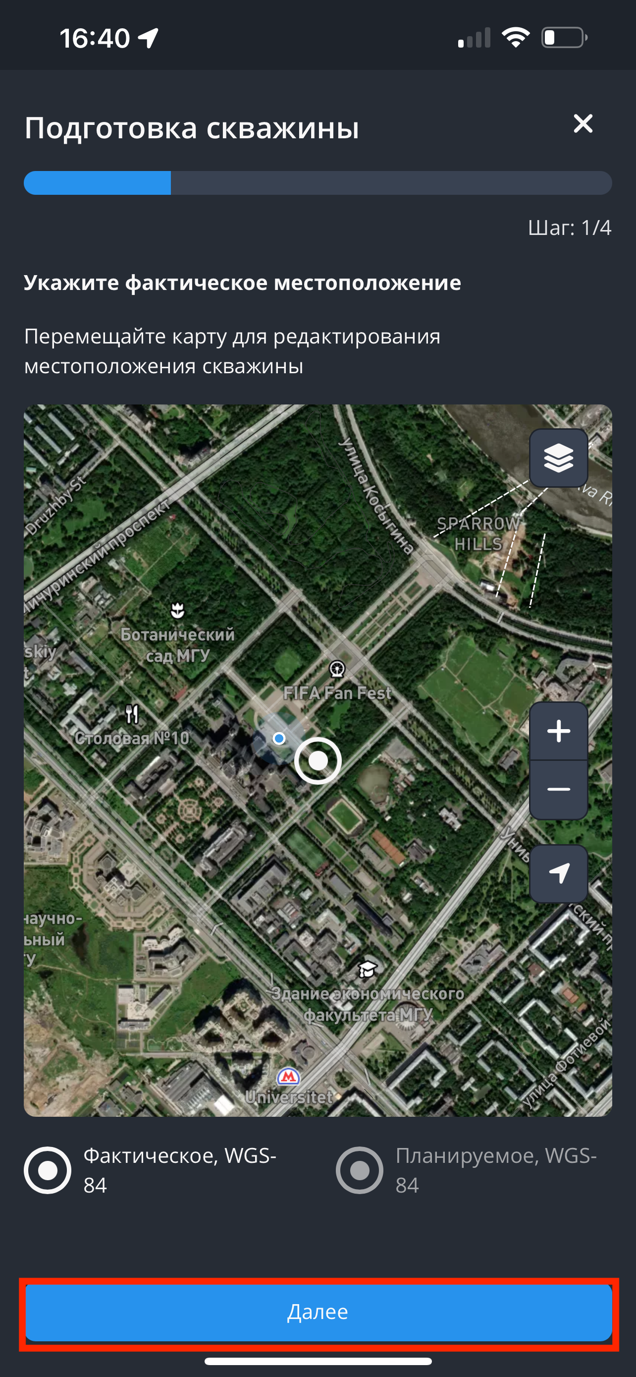 На данном этапе требуется указать фактическое местоположение выработки и нажать кнопку «Далее».