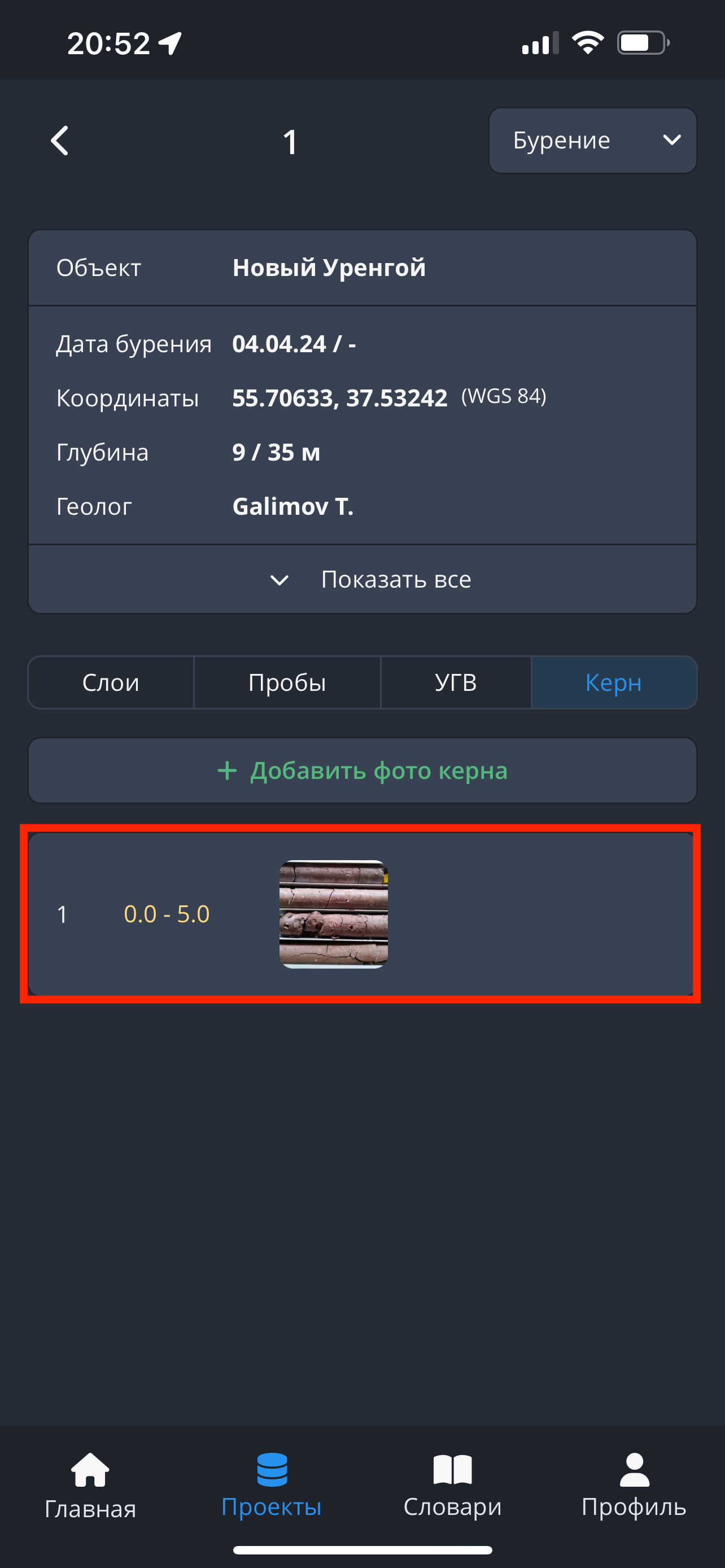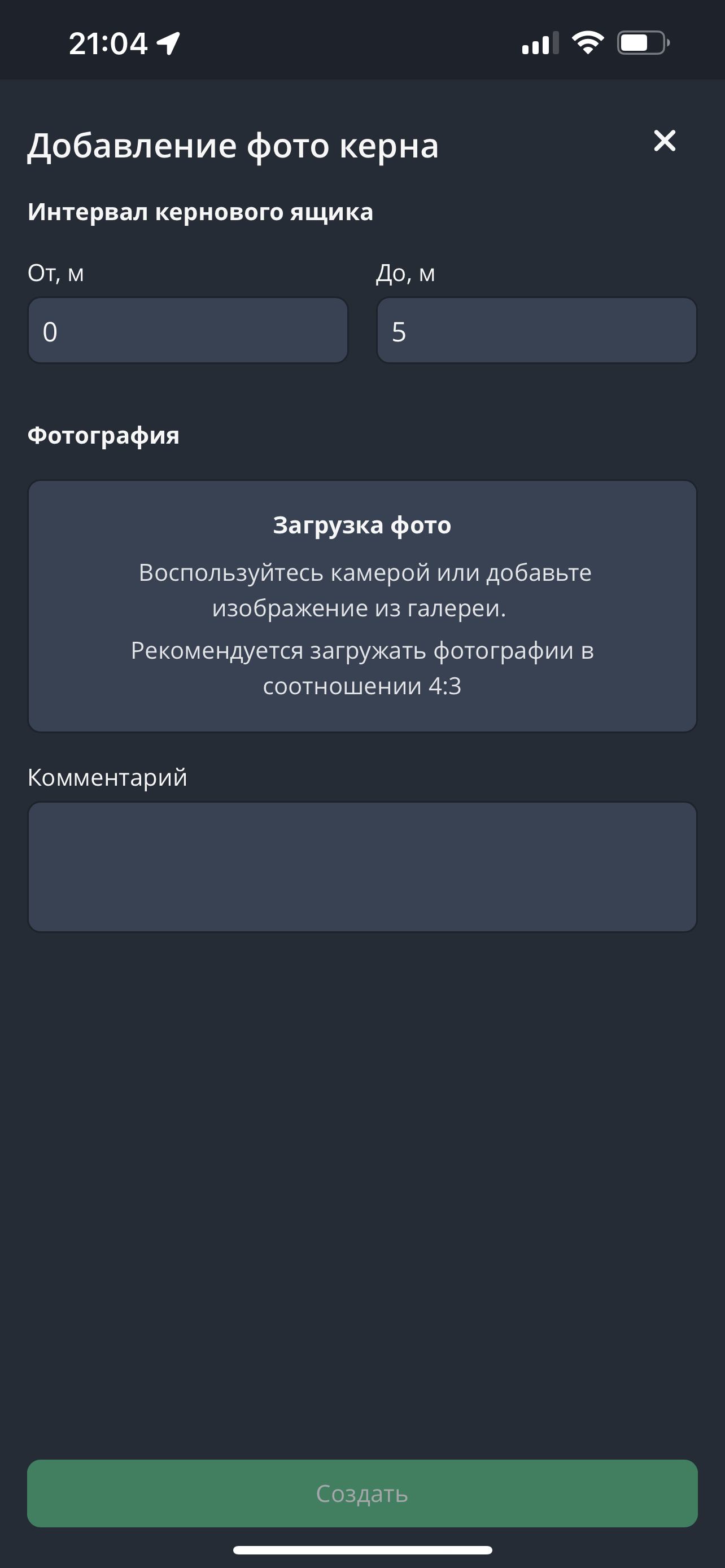- Во вкладке “Фото керна” нажмите на кнопку "Добавить фото керна". Для добавления фотографий необходимо нажать кнопку «Загрузка фото», выбрать изображения из галереи устройства или сделать снимок.