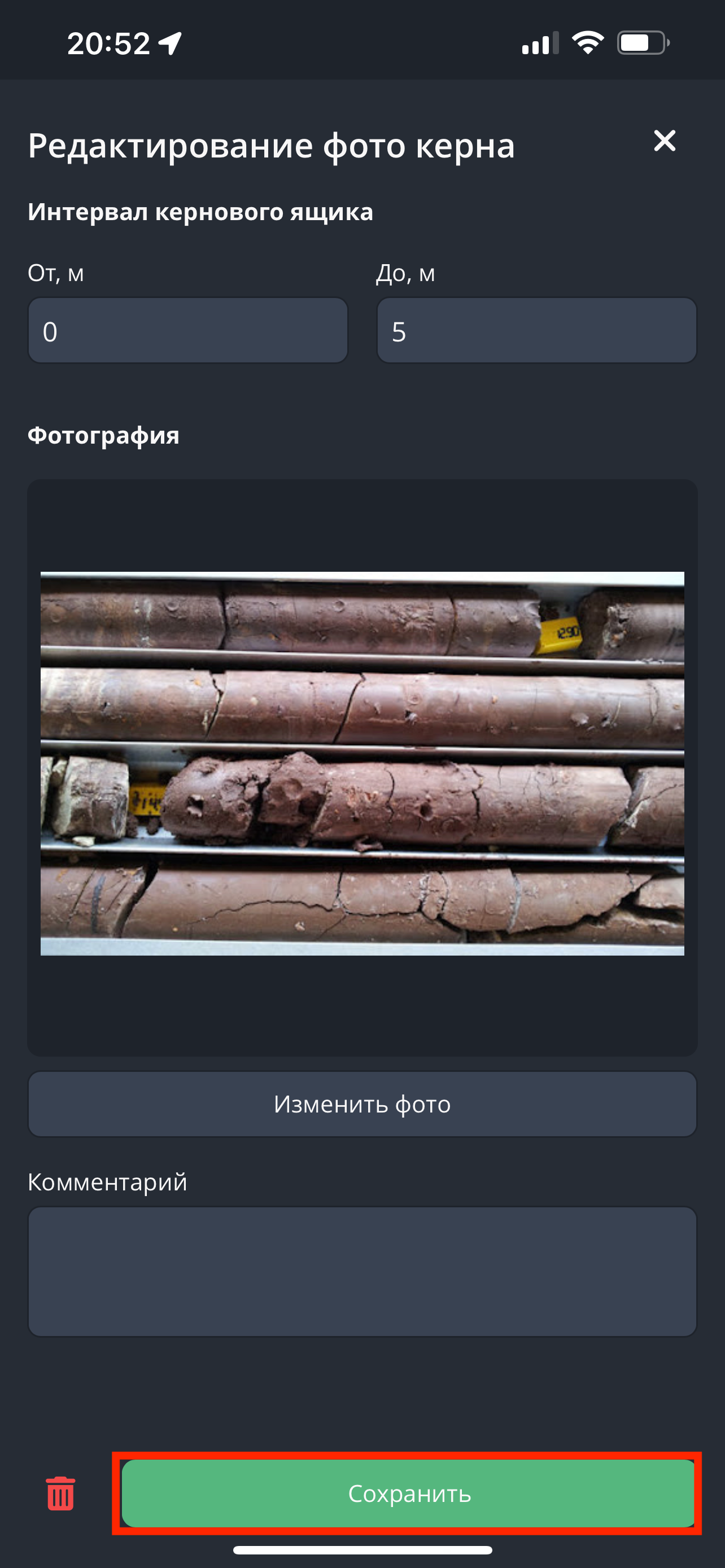 - В разделе "Редактирование фото керна" отредактируйте интересующую информацию, затем нажмите на кнопку "Сохранить"