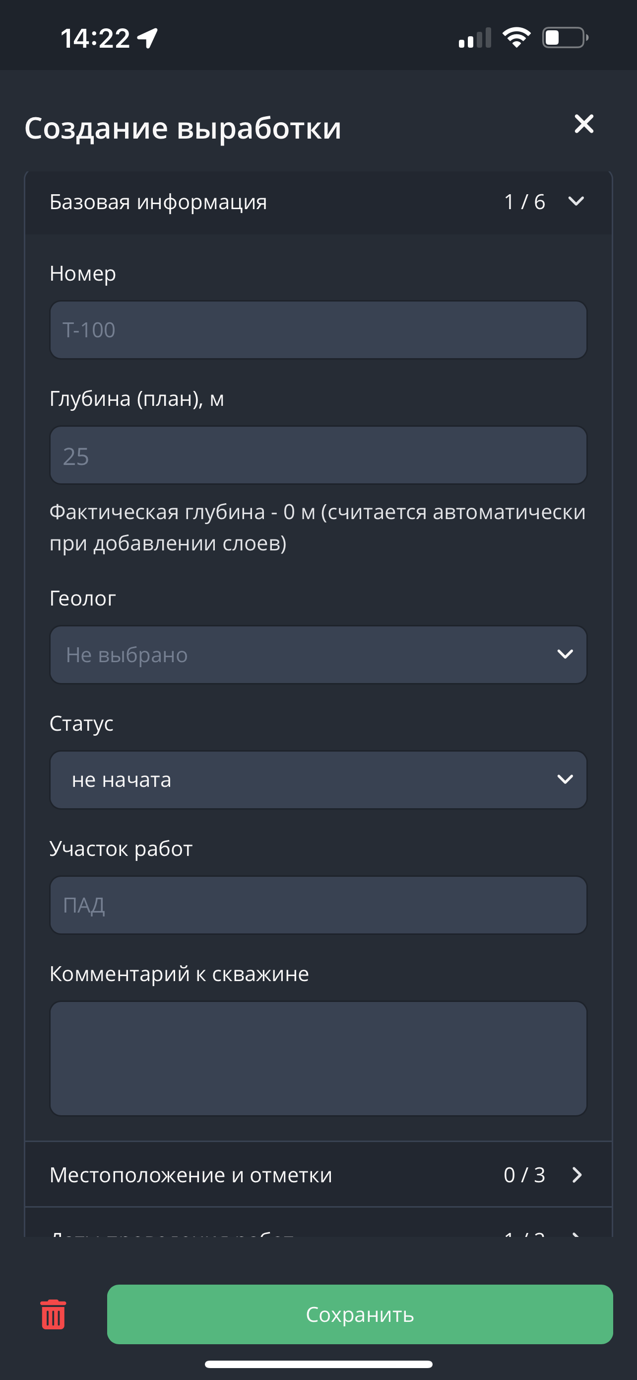 - Создание выработки подразумевает заполнение информации по скважине. Укажите базовую информацию: номер скважины, планируемую глубину, геолога, статус выработки, участок работ. Также есть возможность оставить комментарий.