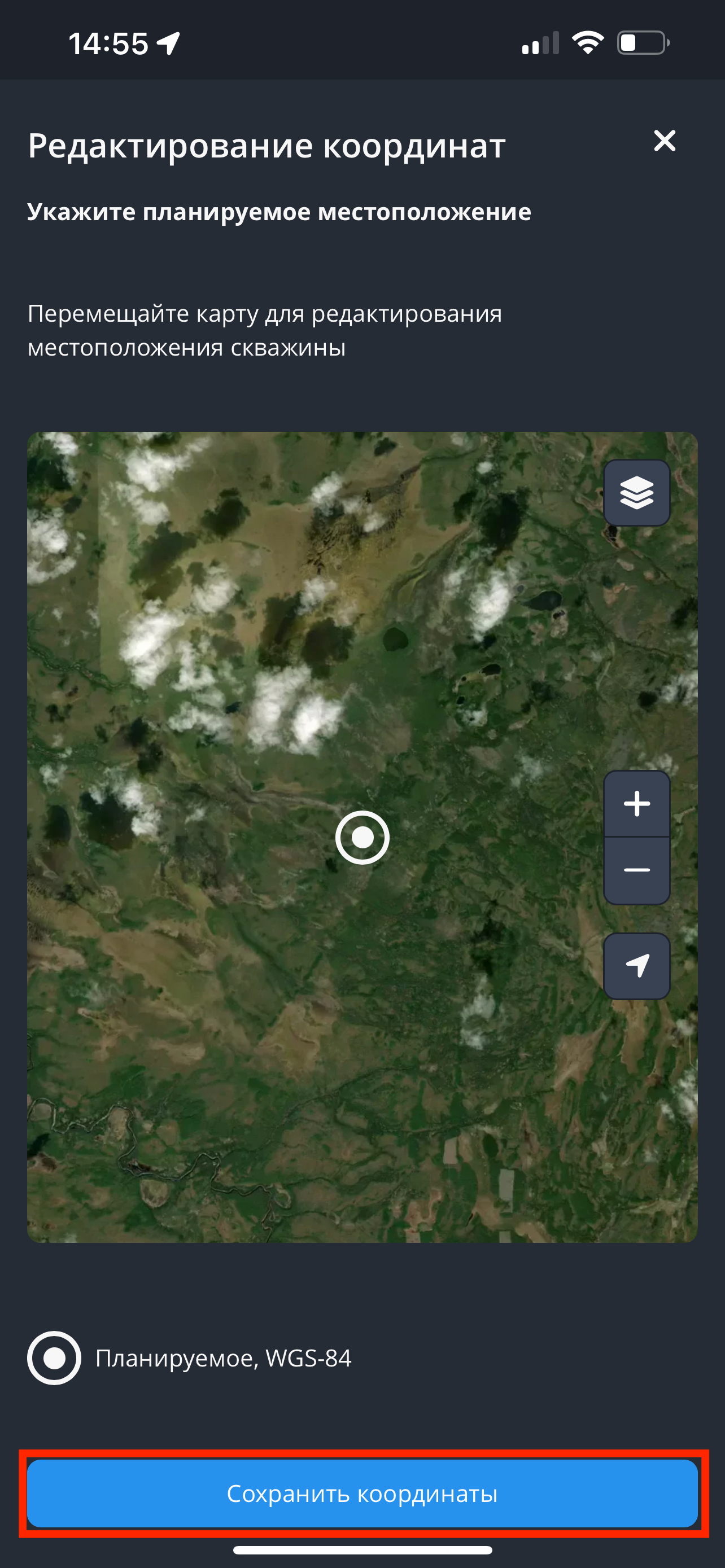 - Указать местоположение на карте. Для этого нажмите на кнопку "Указать на карте". Затем на карте выберите местоположение скважины и нажмите кнопку "Сохранить координаты". В таком случае поле "Абсолютная отметка" заполняется вручную.