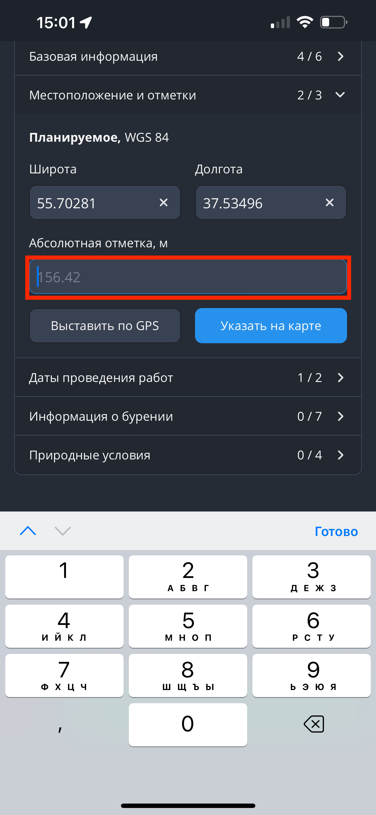 - Заполнить поля "Широта", "Долгота" и "Абсолютная отметка, м." вручную.