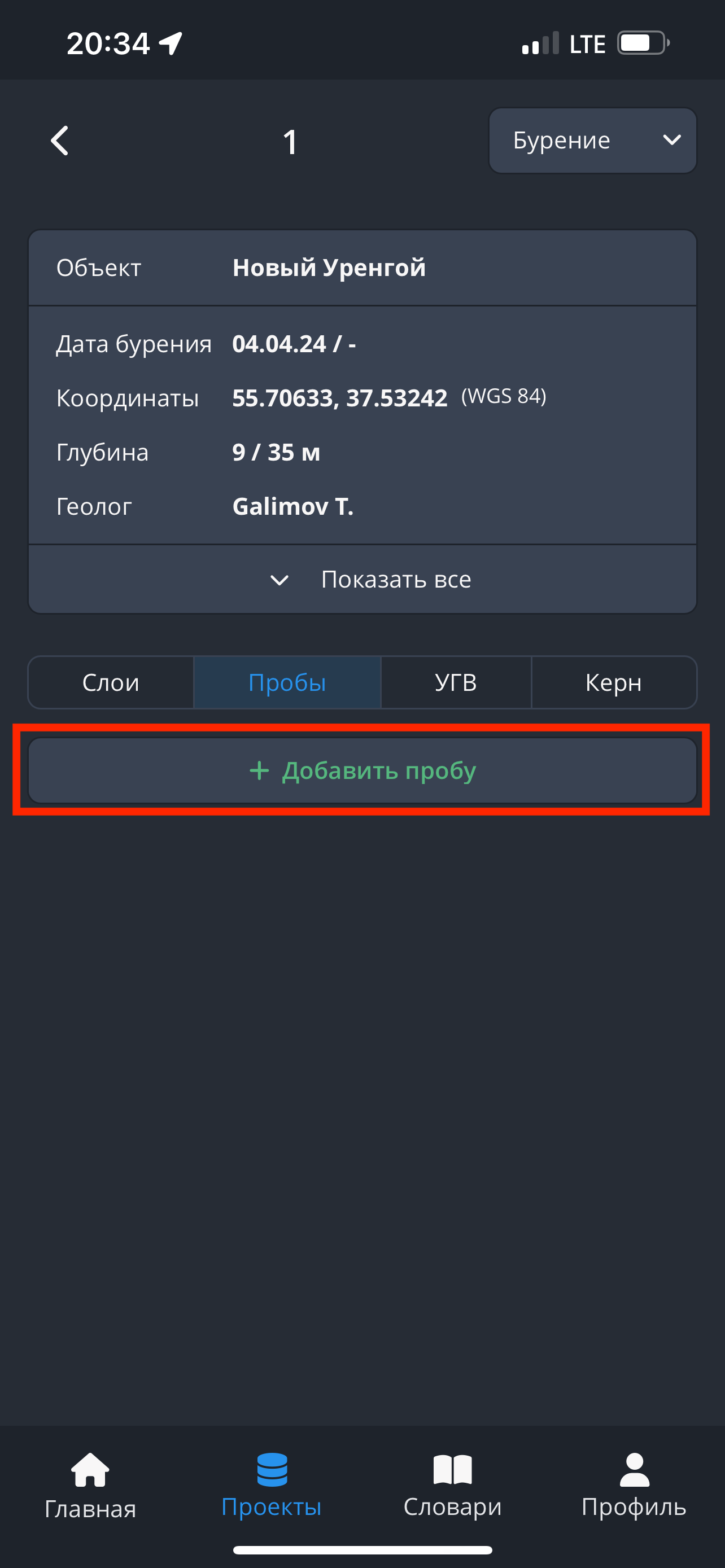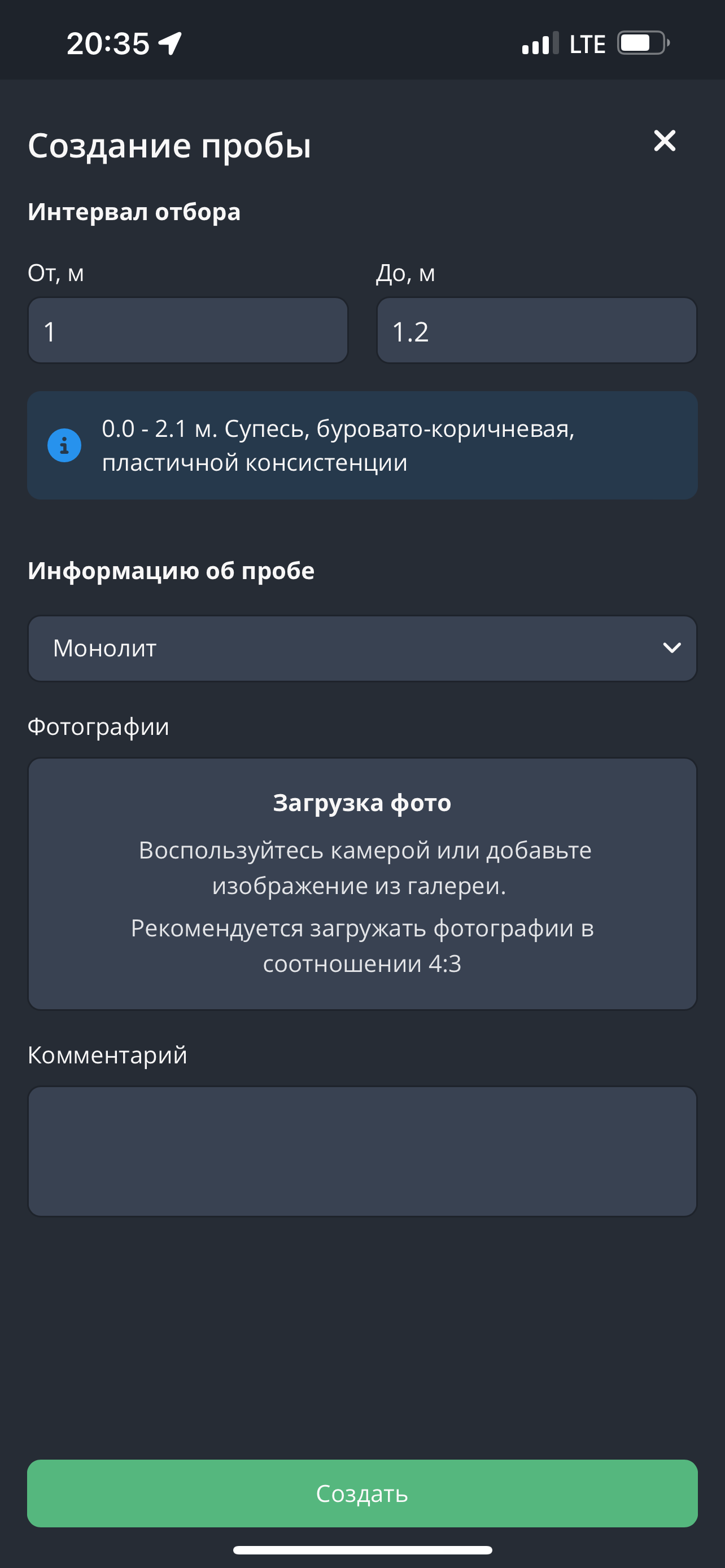 - При добавлении пробы укажите глубину отбора (не может превышать суммарную глубину слоев), тип пробы.