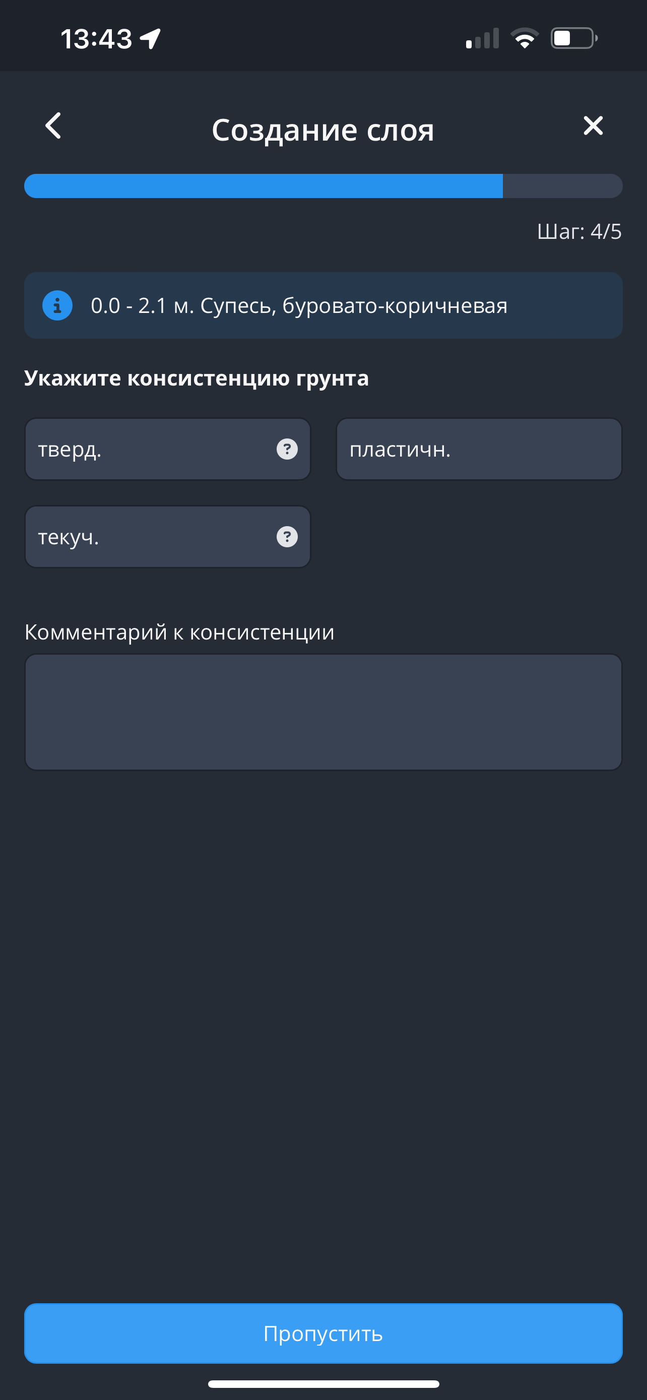 - Всё послойное описание собрано в уникальную для каждого класса грунтов последовательность описываемых характеристик - “Гид описания”. К каждой характеристике есть возможность добавить комментарий в свободной форме. Опции в выпадающих списках также подстраиваются под разновидность грунта. Одновременно с выбором опций на экране появляется текст полного описания грунта.