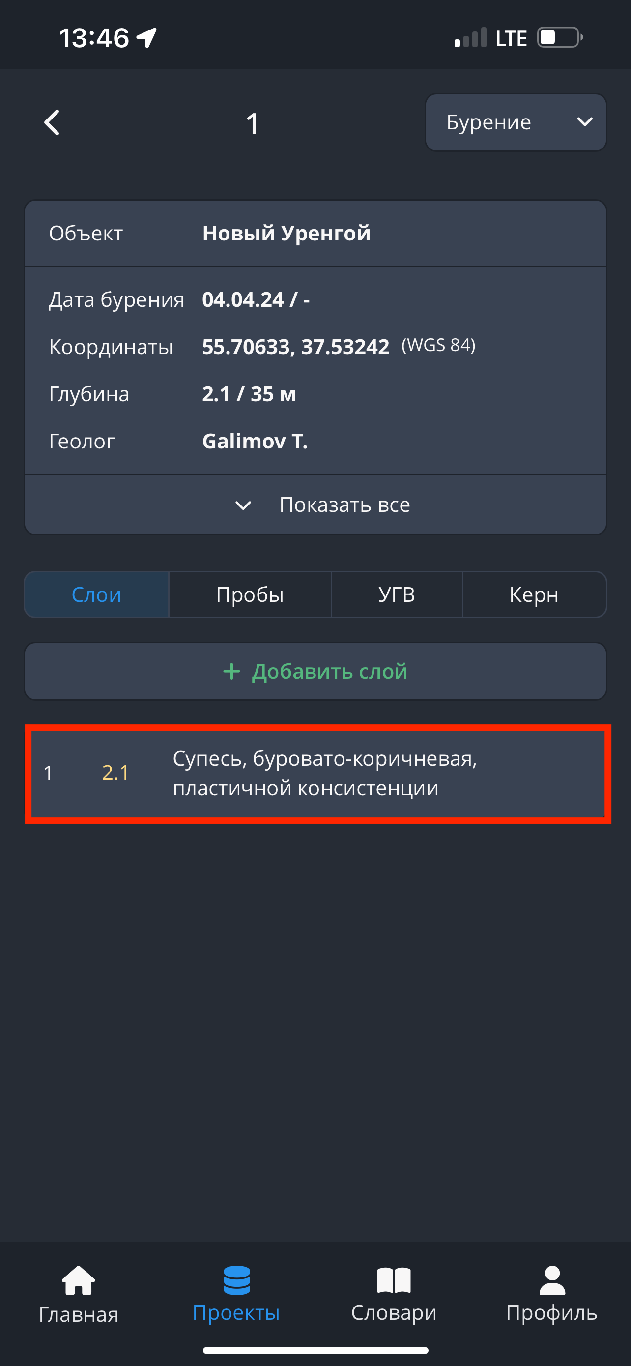 - В приложении Soilbox невозможно добавление слоёв, проб, УГВ и керна в скважины со статусом “Не начата”. Для того, чтобы добавить данные инженерно-геологических скважин, необходимо изменить статус выработки.