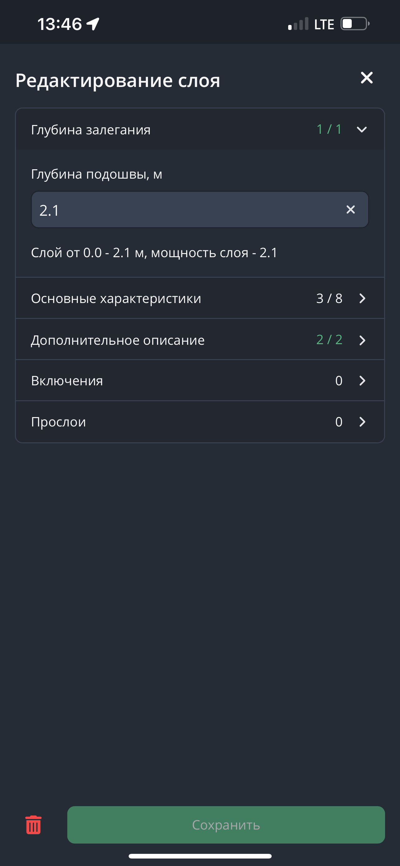 - Для редактирования нам доступны те же атрибуты, которые были представлены в гиде описания слоя, однако доступ к ним реализован через категории: “основные характеристики”, “дополнительное описание”, “включения” и “прослои”.