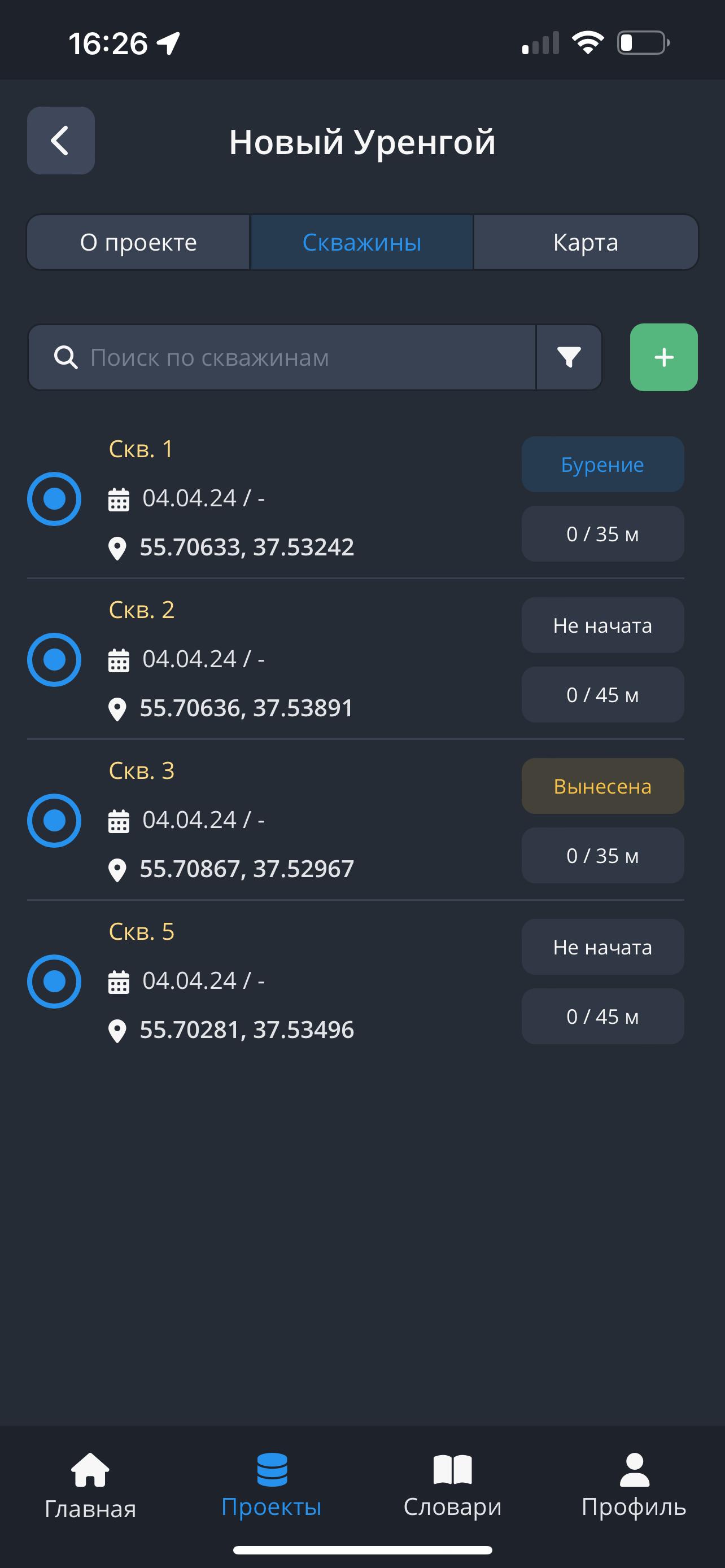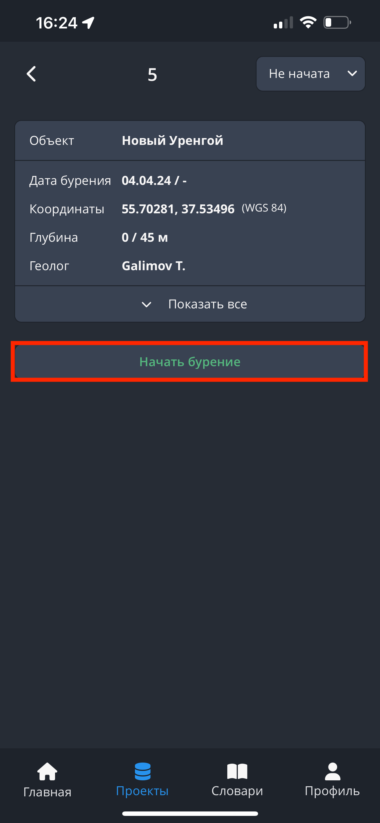 - В разделе "Скважины" нажмите на интересующую вас выработку, перейдите на страницу скважины. Нажмите на кнопку "Начать бурение".