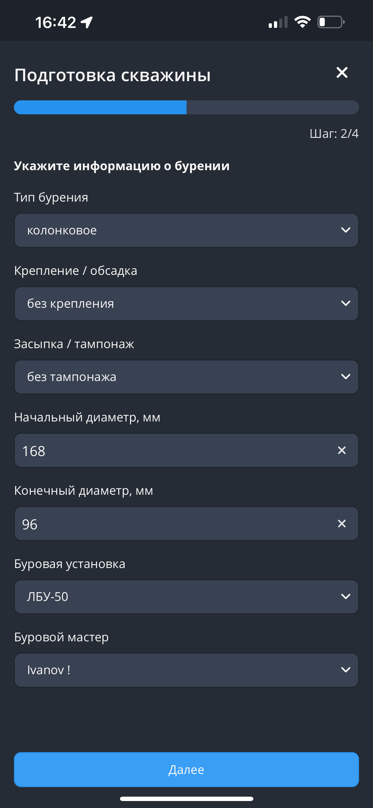 - Укажите информацию о бурении, затем нажмите на кнопку "Далее".