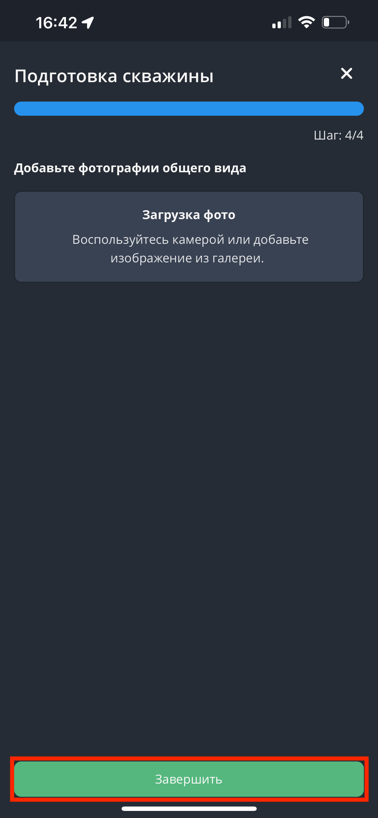 - Загрузите фотографии общего вида скважины. Для добавления фотографий необходимо нажать на кнопку «Загрузка фото», выбрать изображения из галереи устройства или сделать снимок. Раздел “Фотографии” позволяет пользователю загрузить несколько фото. Нажмите на кнопку "Завершить".