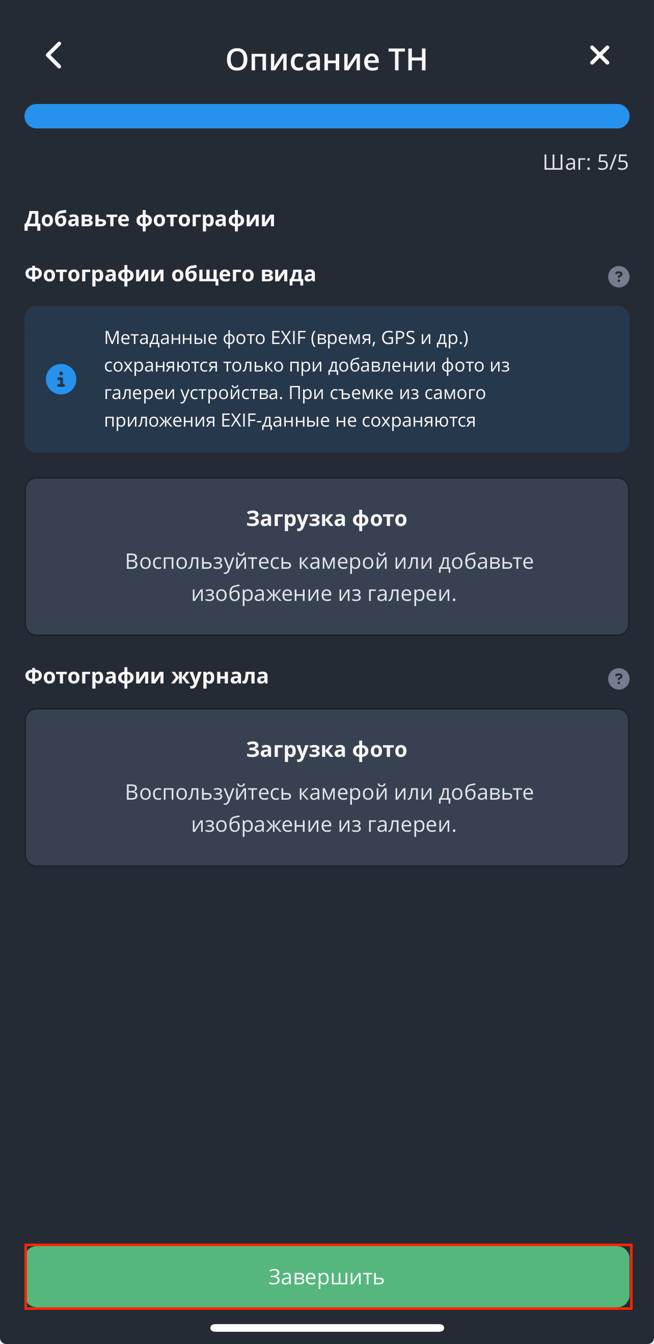 - Загрузите фотографии общего вида и фотографии журнала. Чтобы добавить фотографию, нажмите на кнопку «Загрузка фото» и выберите изображение из галереи устройства или сделайте снимок на камеру устройства. После добавления фотографий нажмите на кнопку «Завершить».