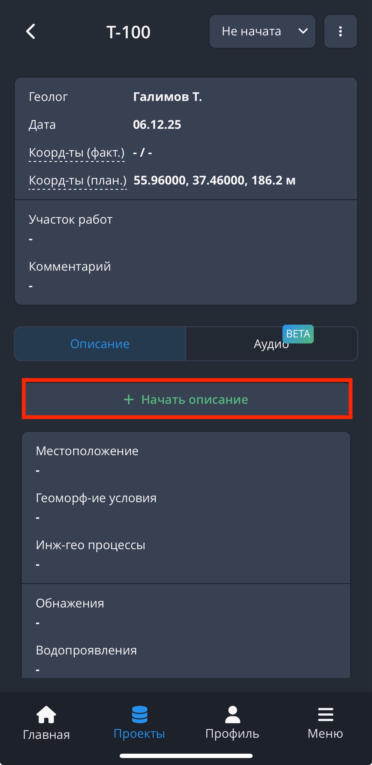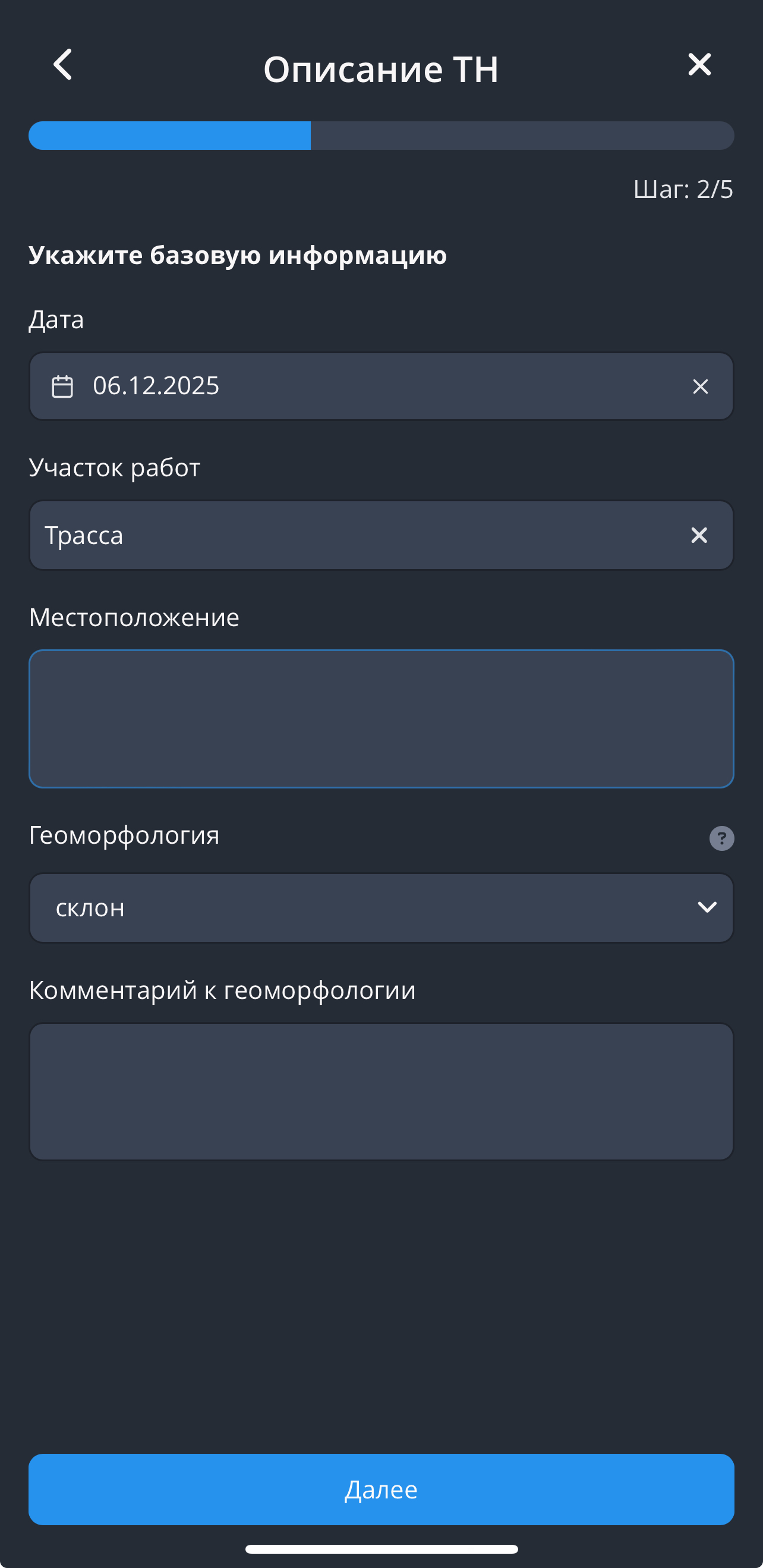 - Укажите базовую информацию: дату, участок работ, текстовое описание местоположения, геоморфологию и комментарий при необходимости. Затем нажмите на кнопку «Далее».