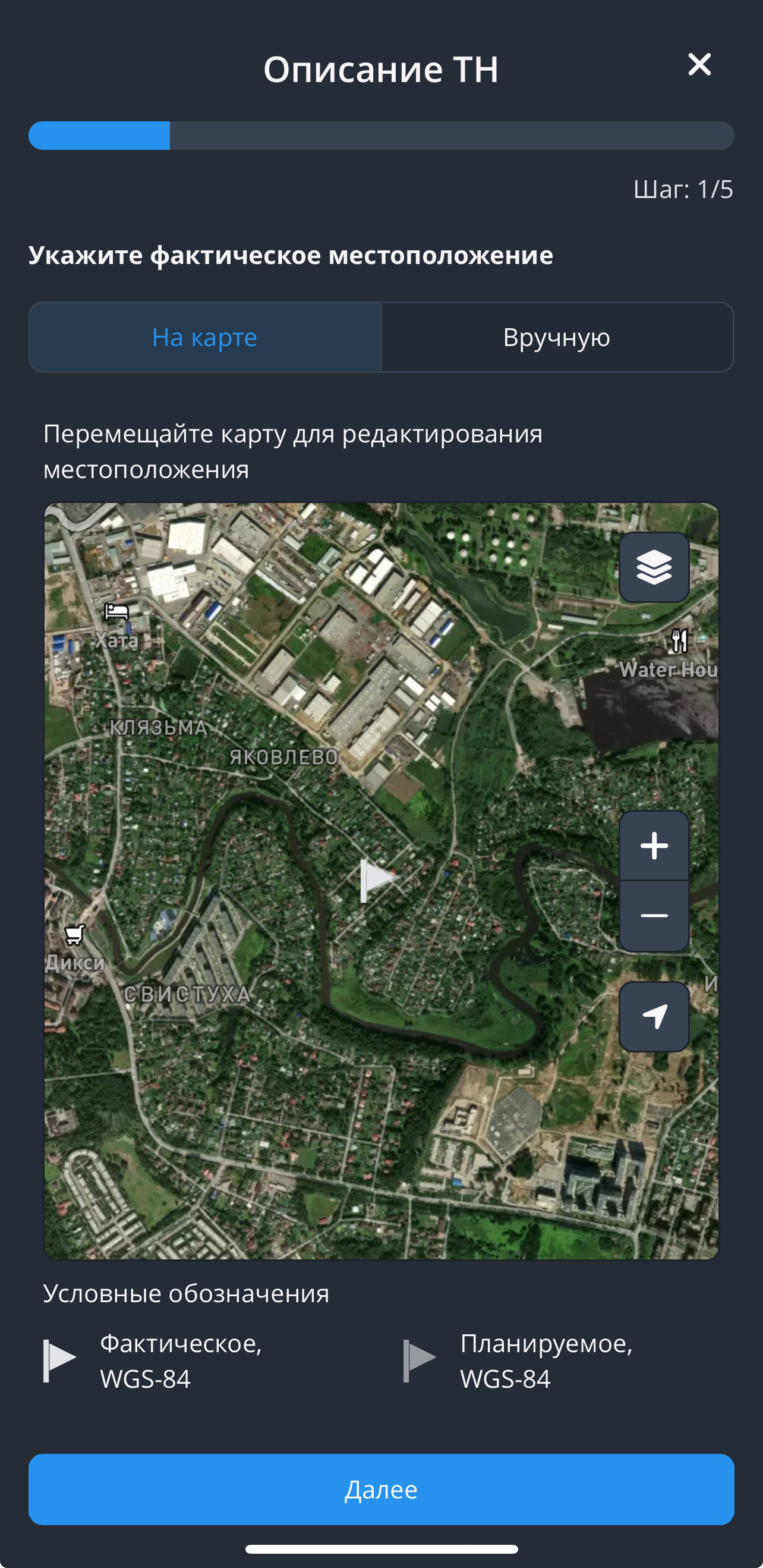 Далее необходимо выполнить предлагаемые шаги по подготовке описания точки наблюдения. На данном этапе требуется указать фактическое местоположение точки наблюдения и нажать кнопку «Далее».