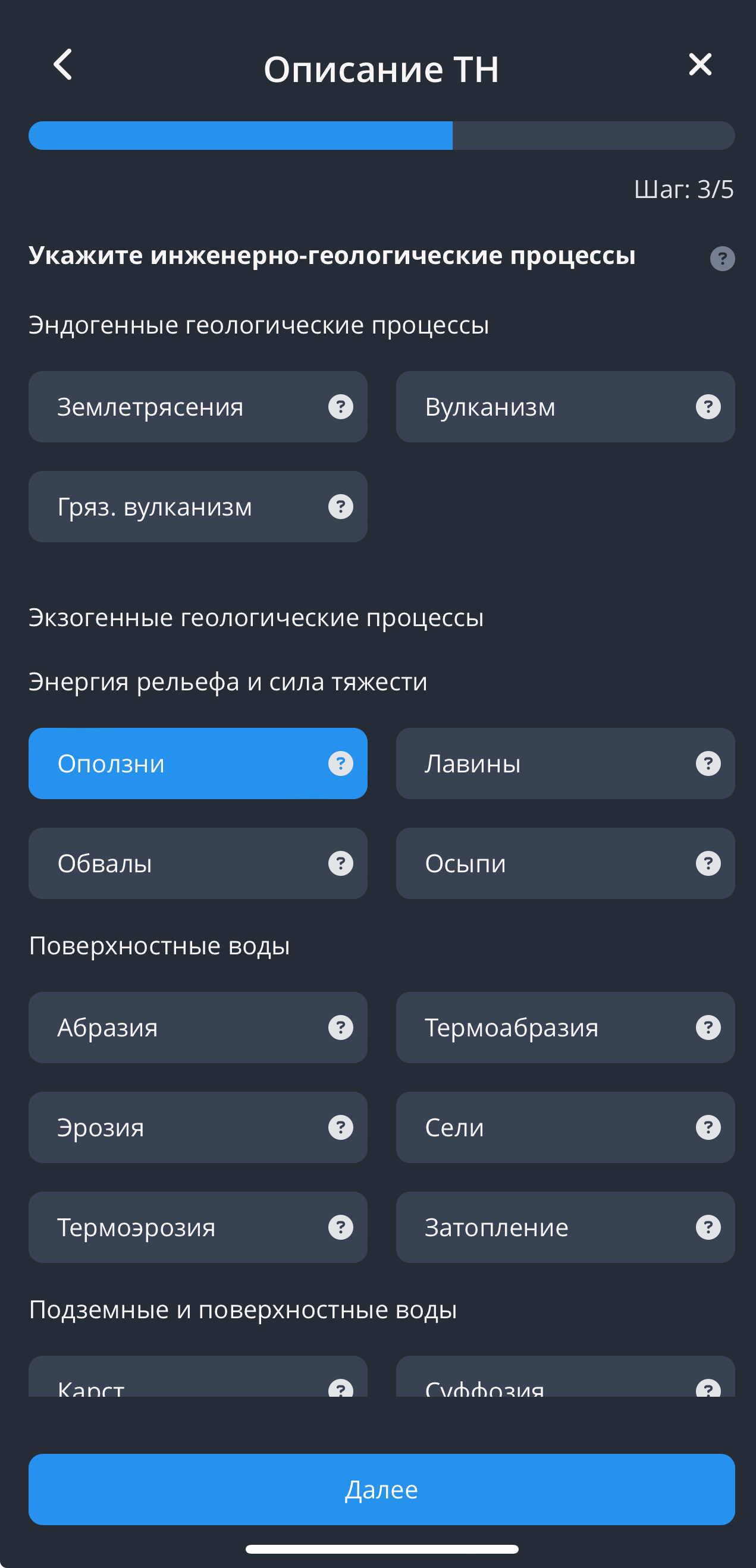 - Укажите инженерно-геологические процессы, затем нажмите на кнопку «Далее».