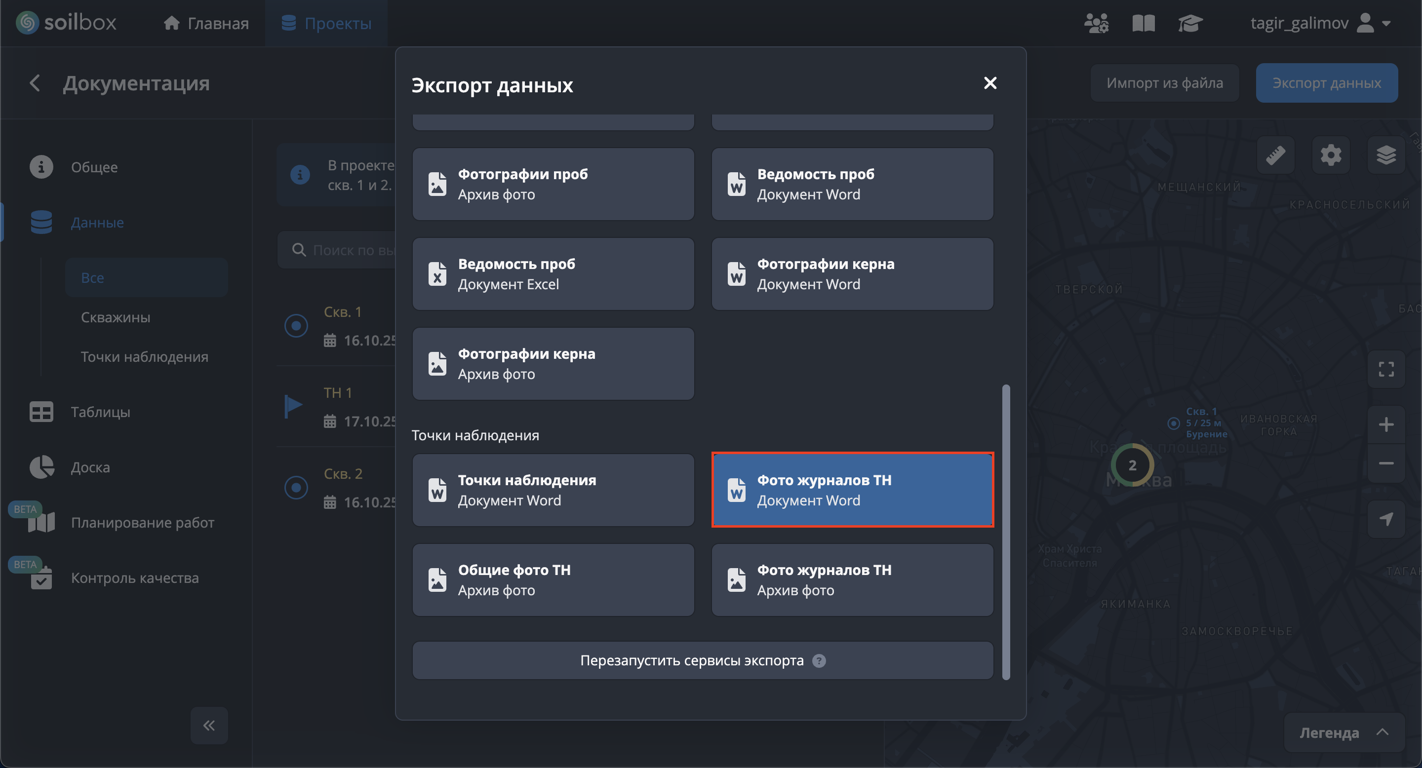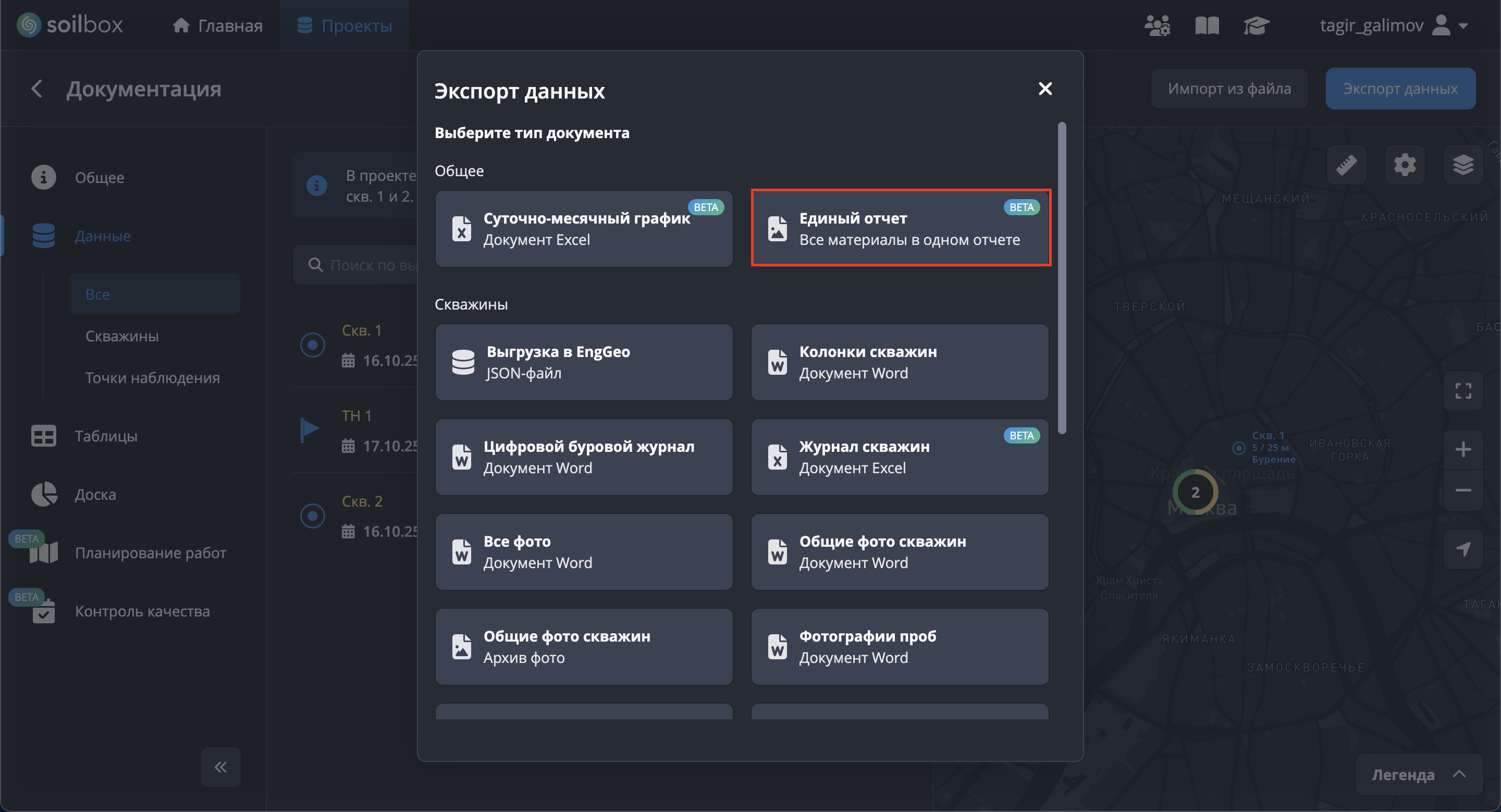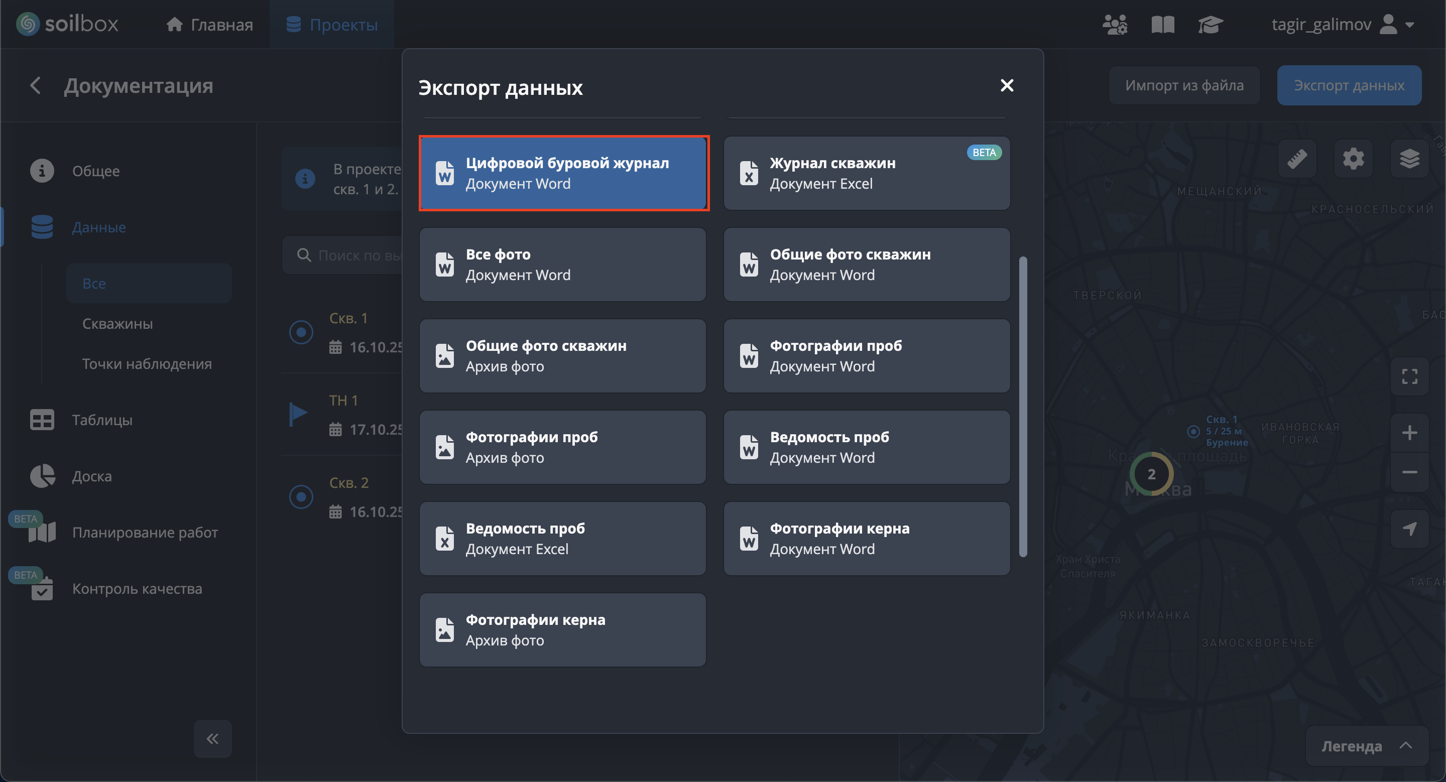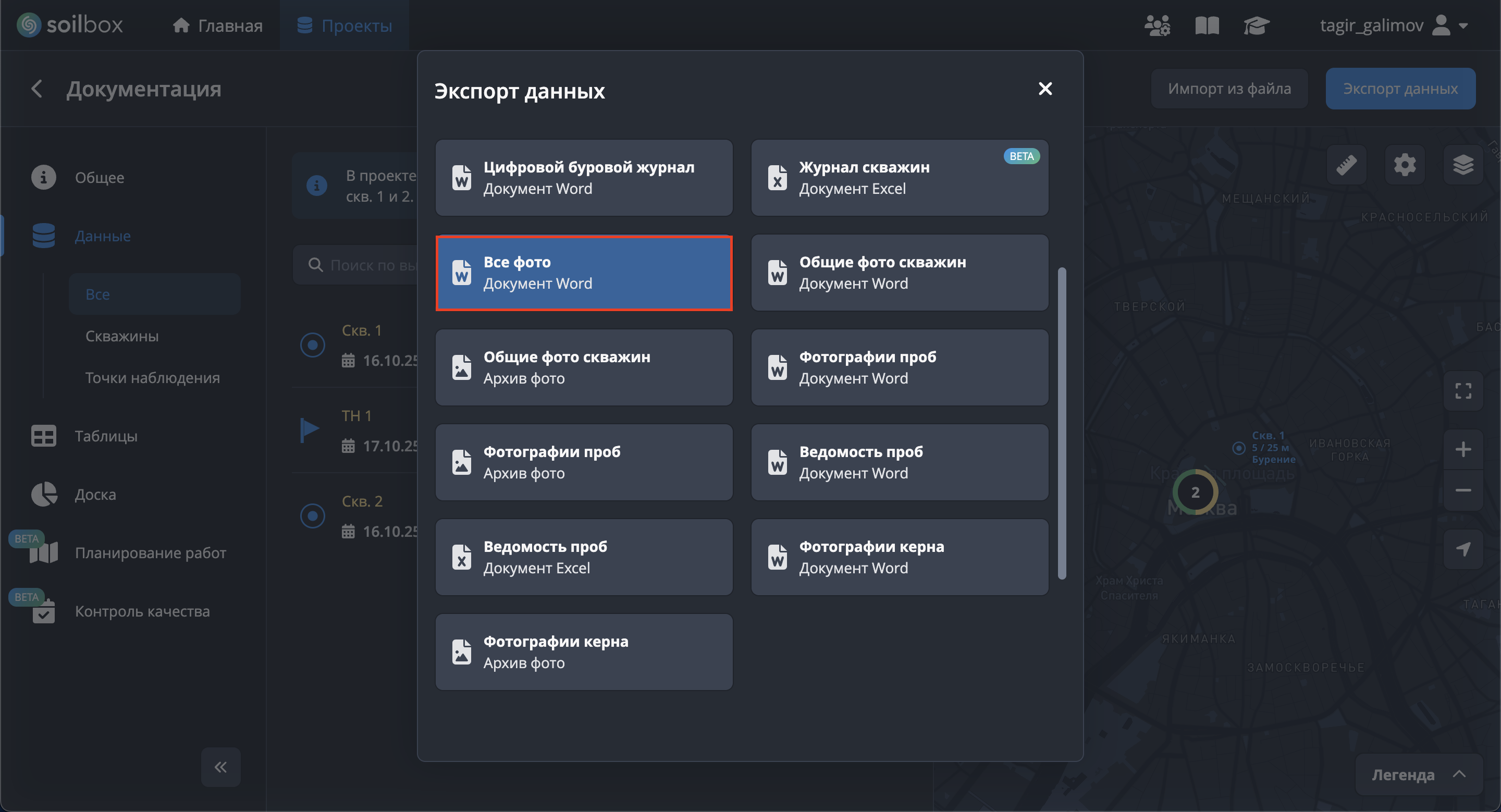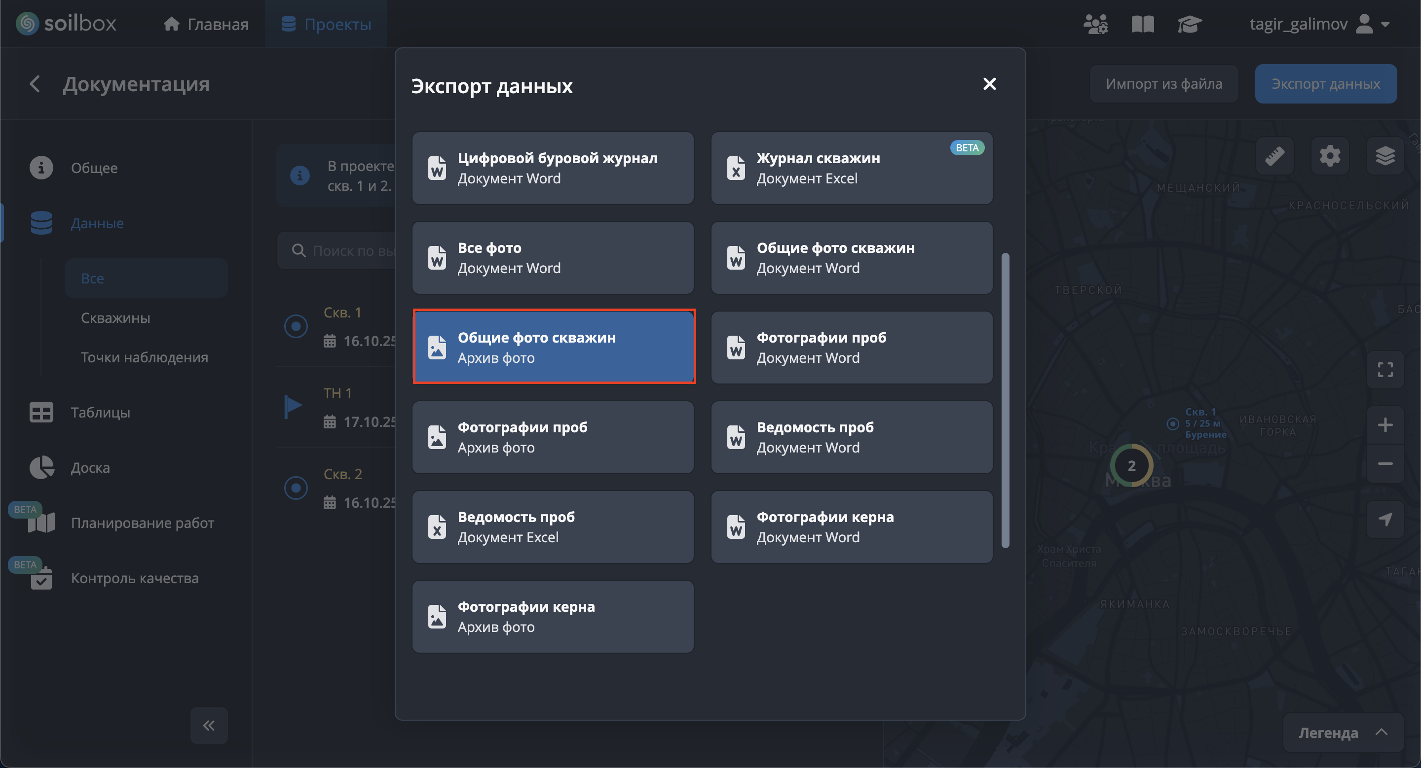 - Нажмите "Выбрать скважины для экспорта", отметьте скважины → "Применить".