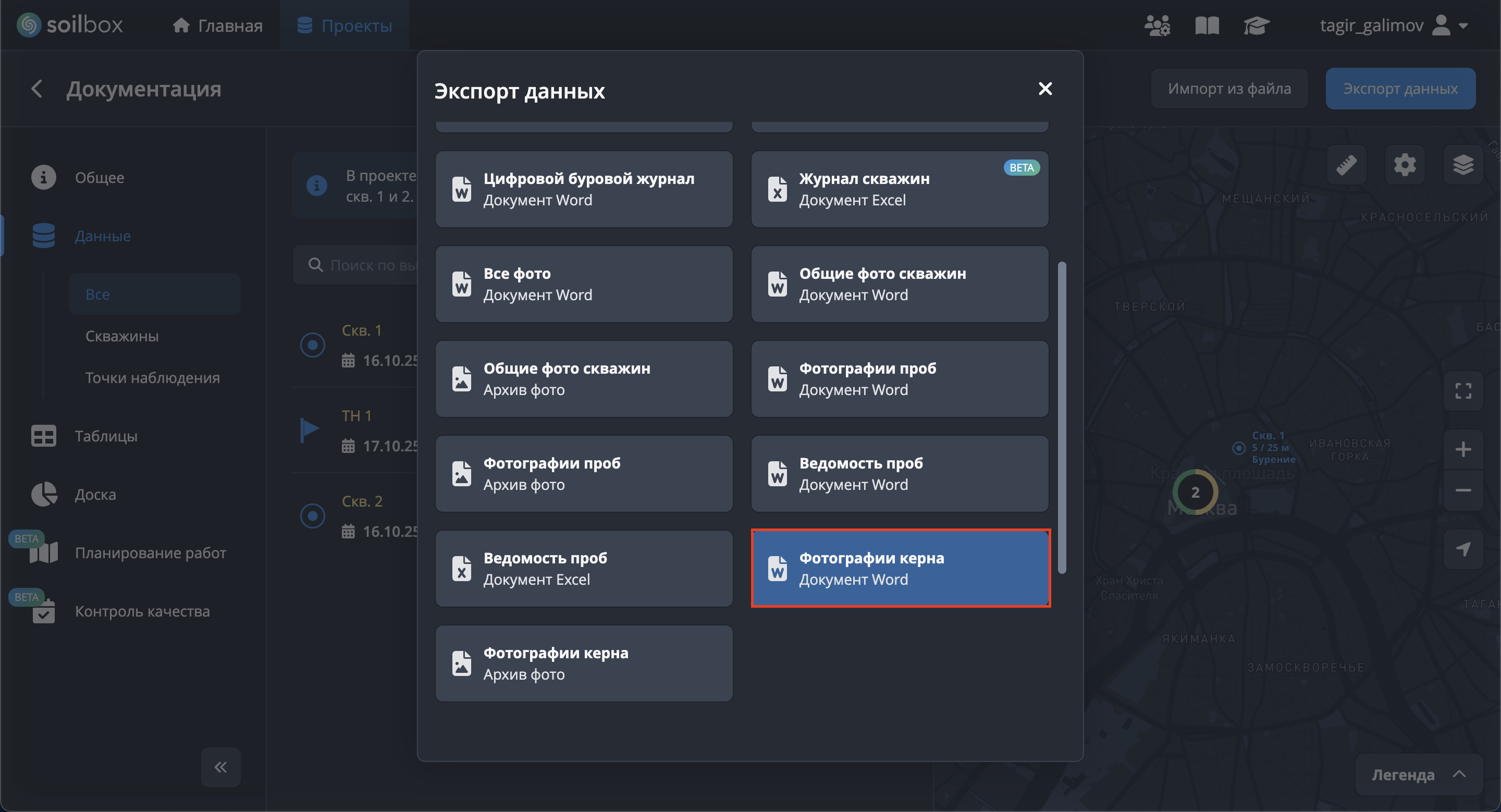Для экспорта фото керна обязателен выбор скважин.