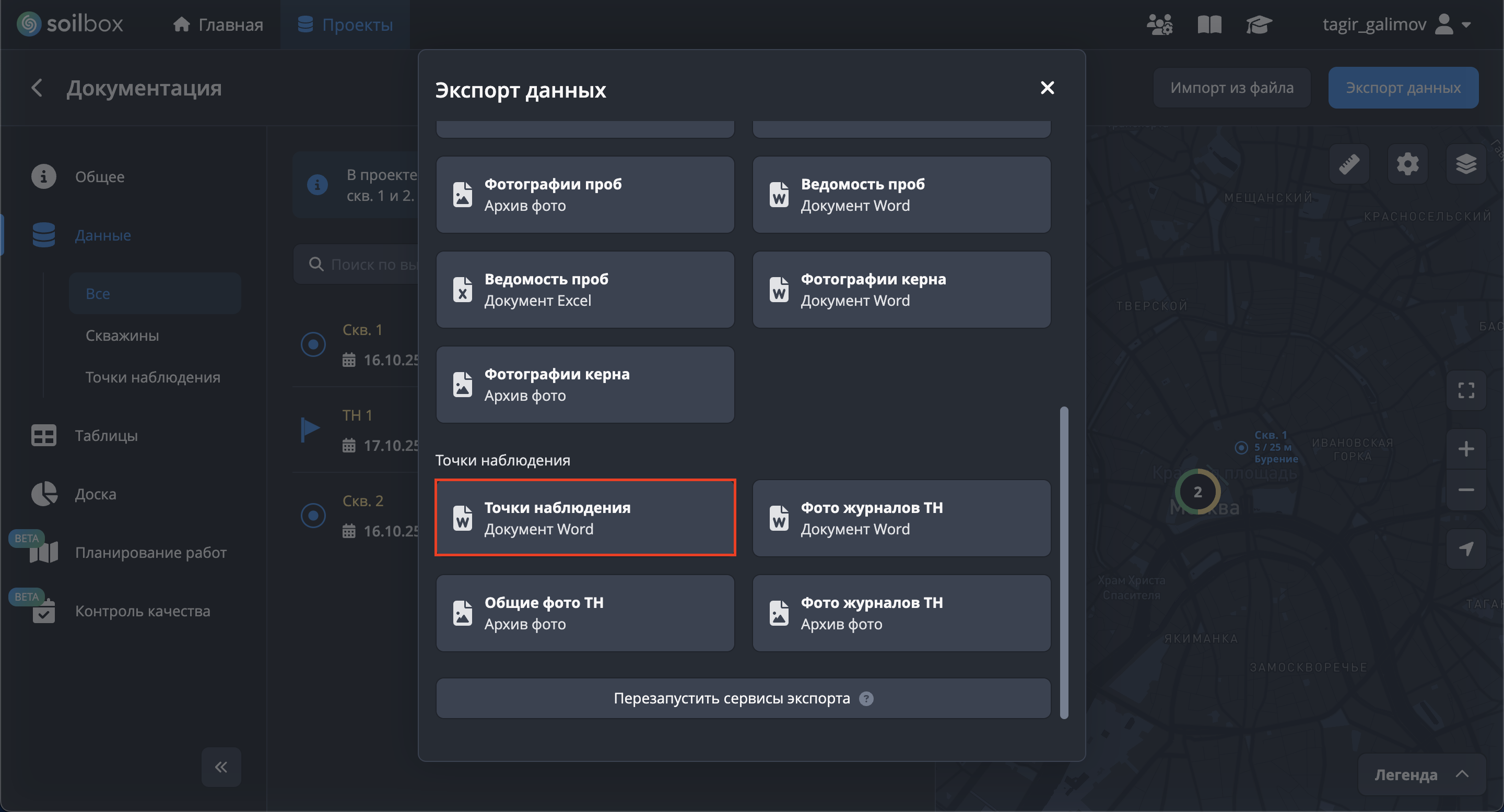 - Нажмите "Выбрать точки наблюдения для экспорта", отметьте точки → "Применить".
