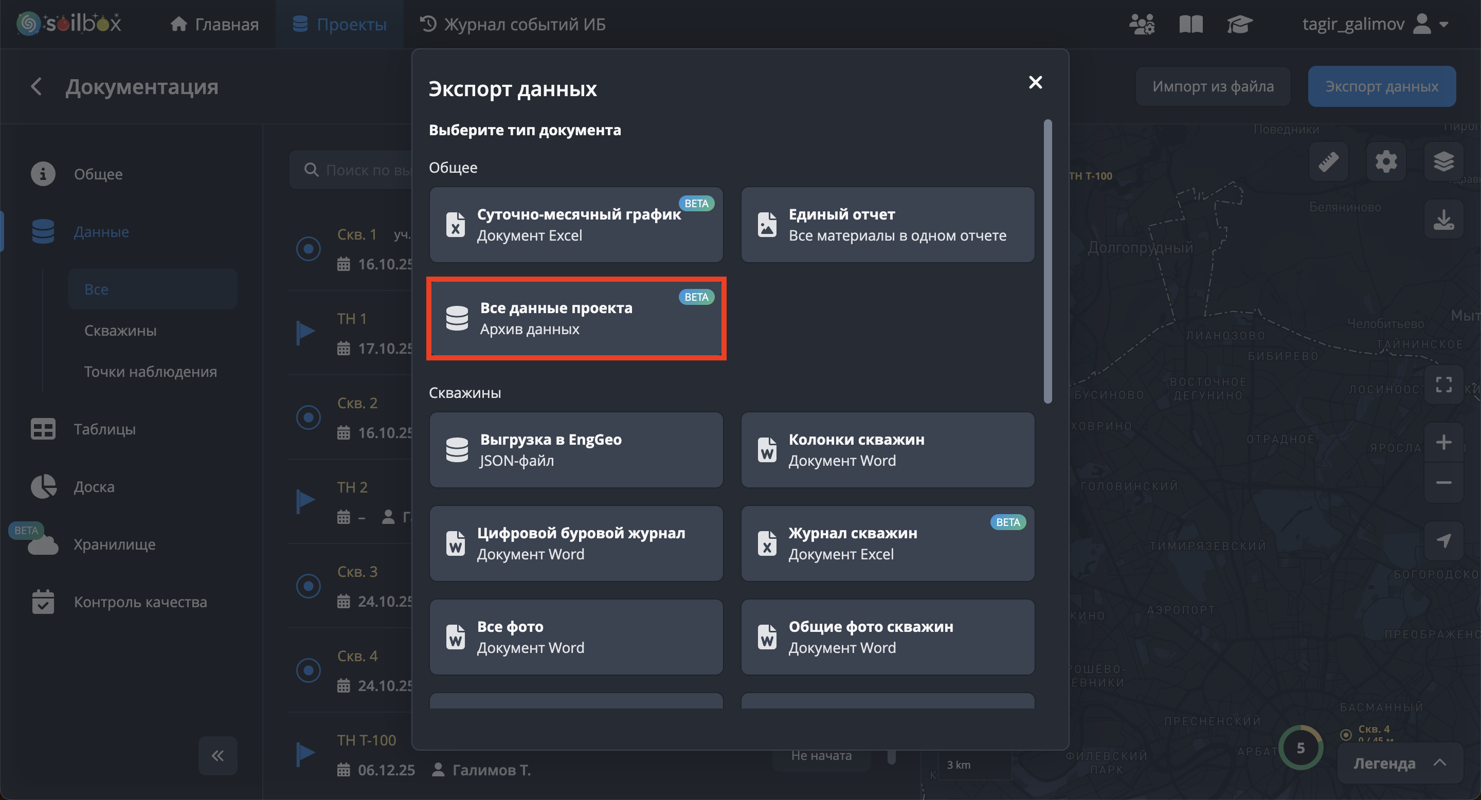 Для экспорта данных перейдите на страницу проекта и нажмите на кнопку "Экспорт данных", расположенную в правой части страницы.