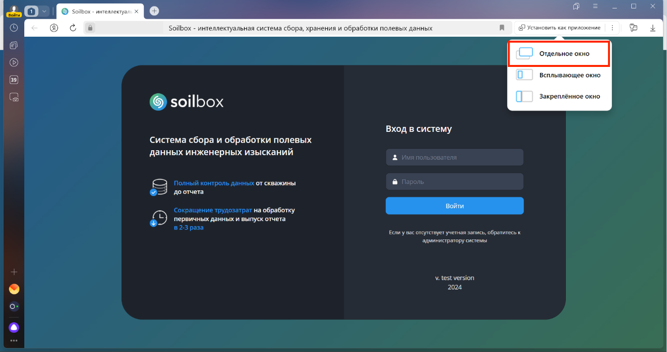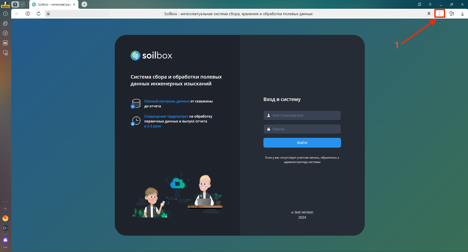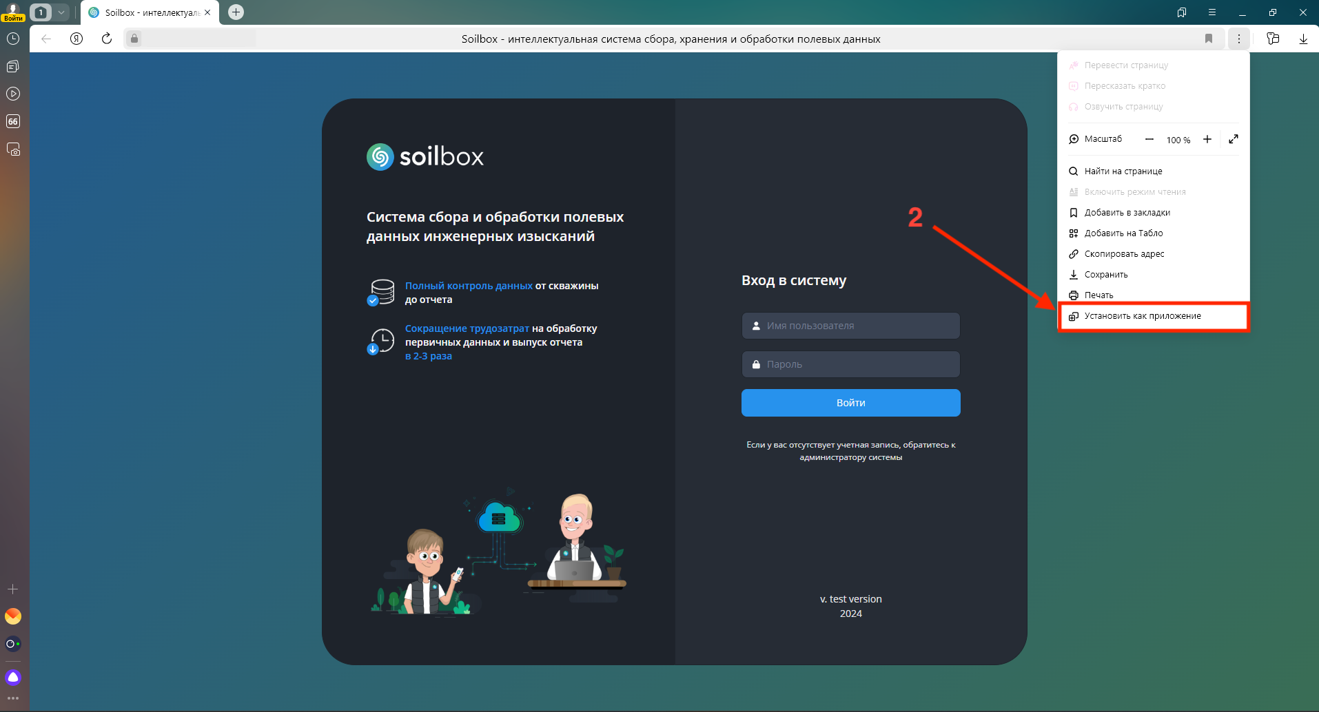 - В правом верхнем углу нажать "Установите приложение Soilbox" (кнопка 1).