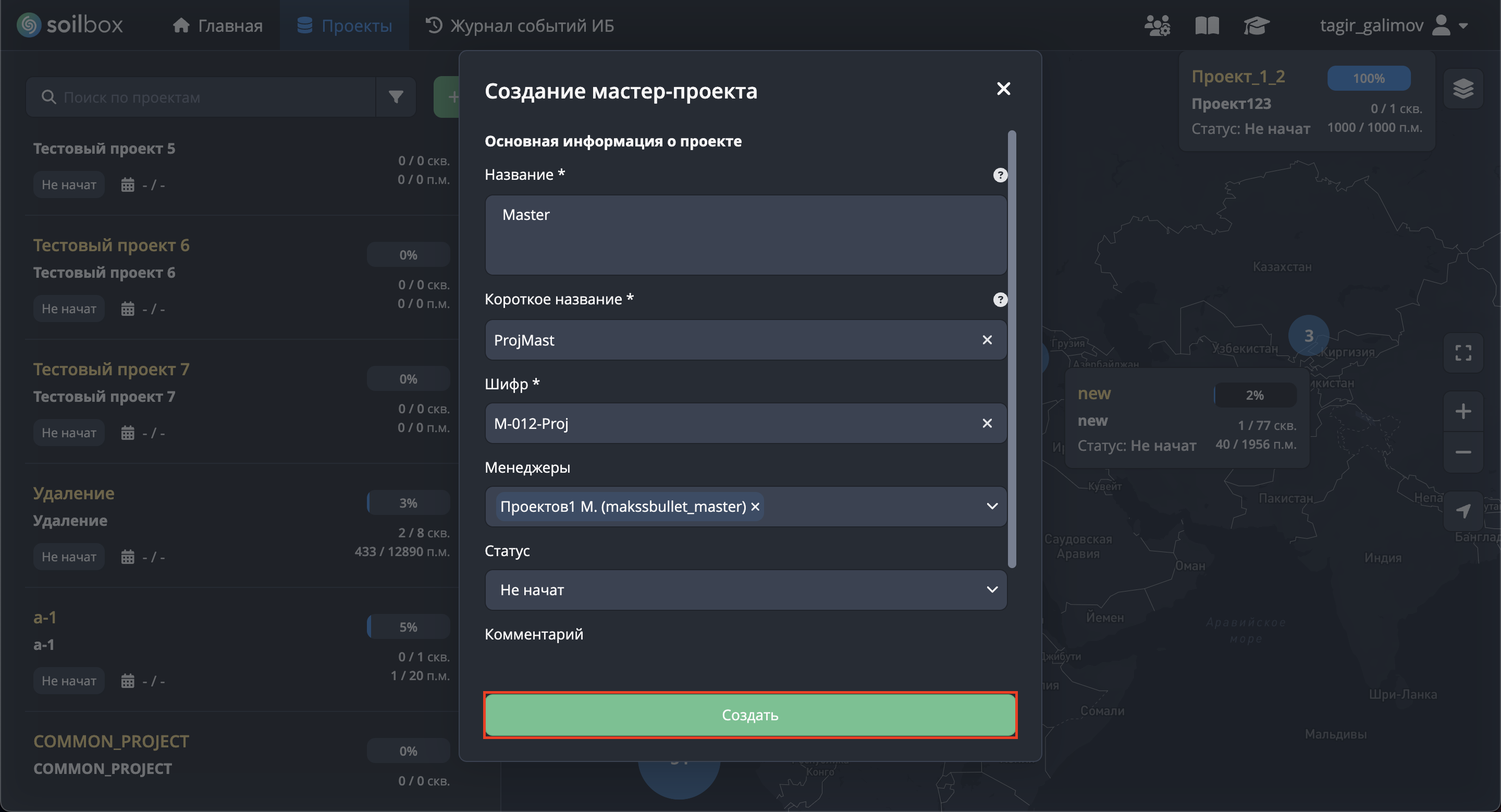 - Перейдите в раздел «Проекты» и нажмите кнопку «+». В выпадающем меню выберите пункт «Создать мастер-проект».