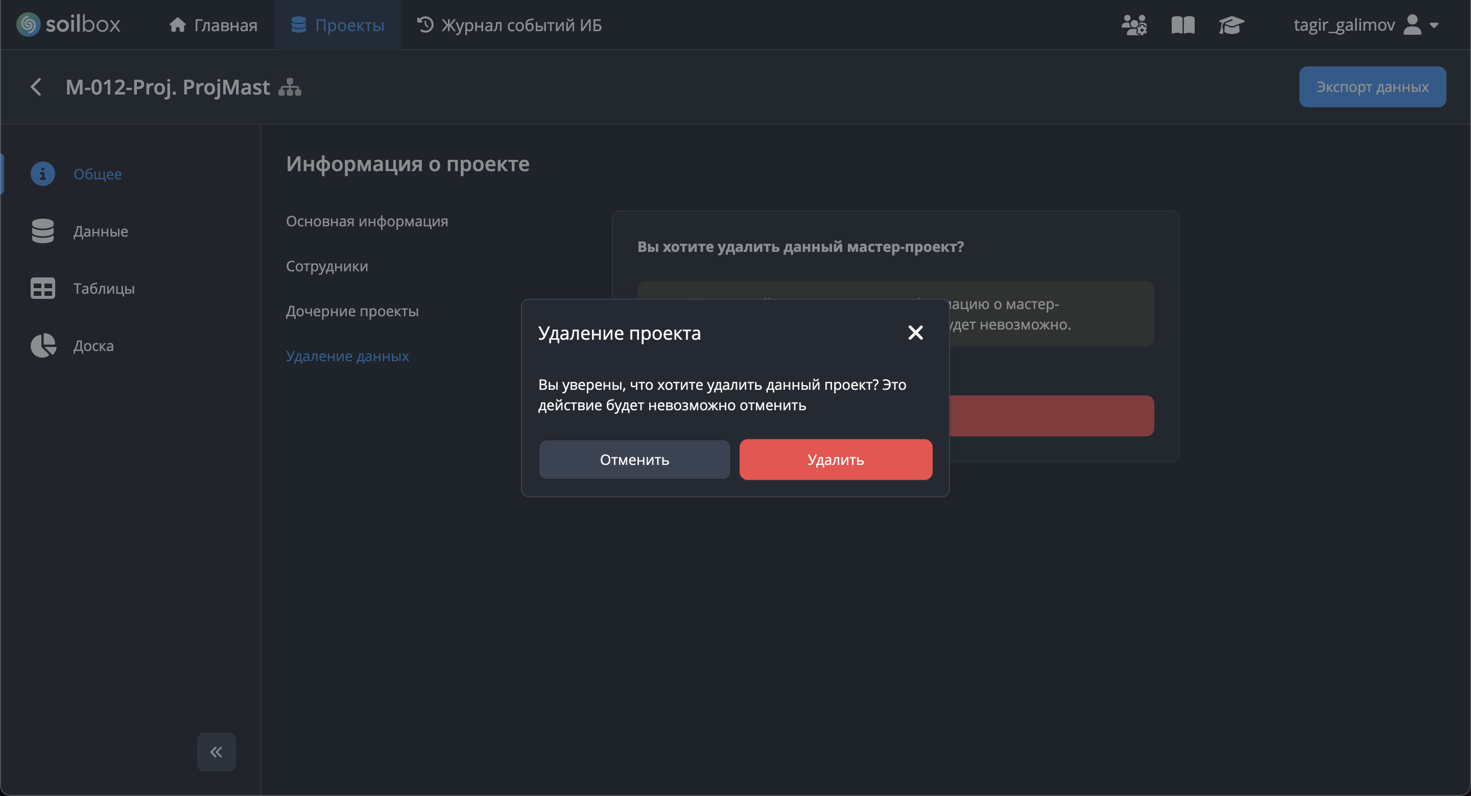 - Откройте вкладку «Удаление данных» и нажмите «Удалить мастер-проект».