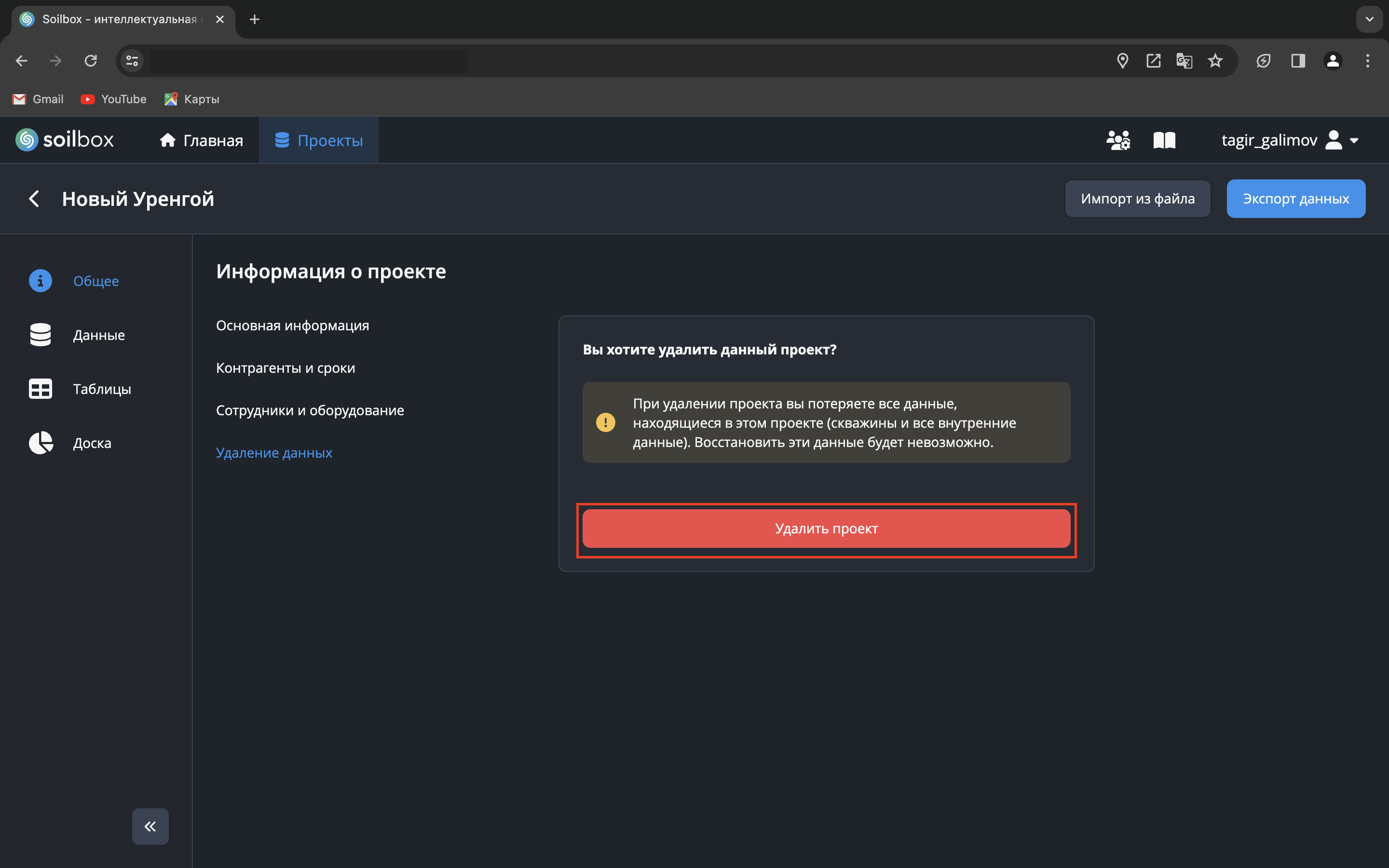 - Откройте вкладку «Удаление данных» и нажмите кнопку «Удалить проект».