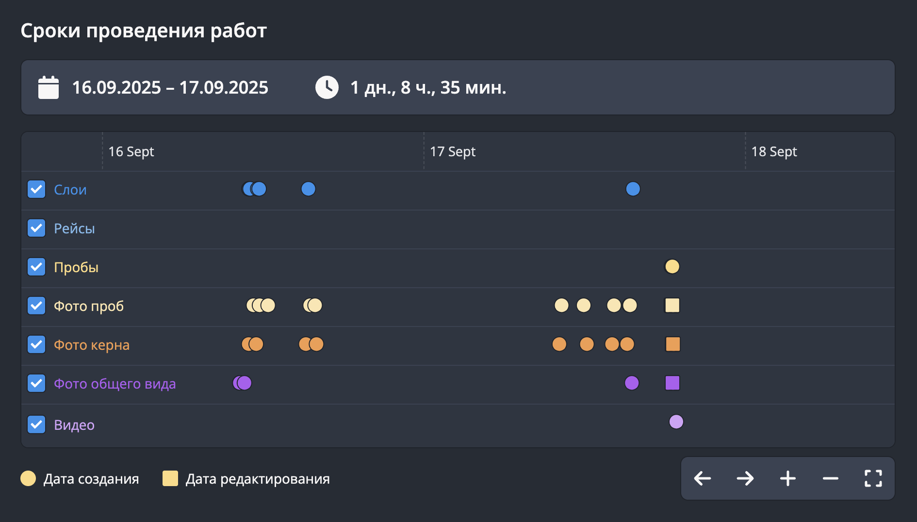 На временной шкале отображаются даты создания и редактирования слоев, проб, рейсов, фотографий и видеоматериалов. Это помогает оценить последовательность и длительность проведения работ.