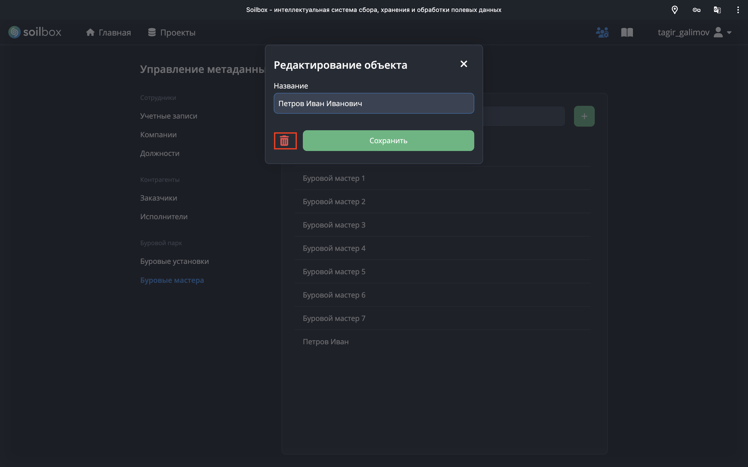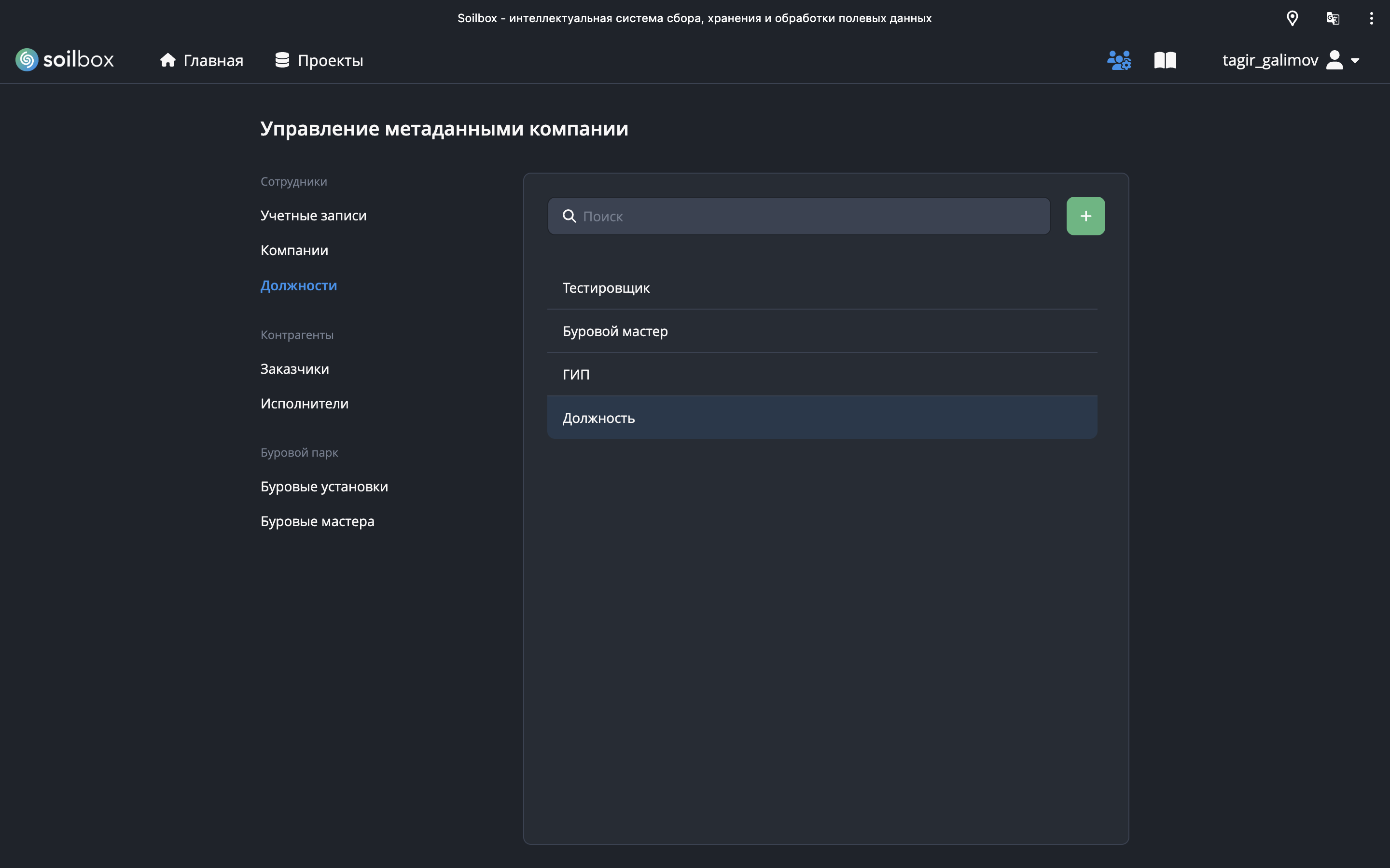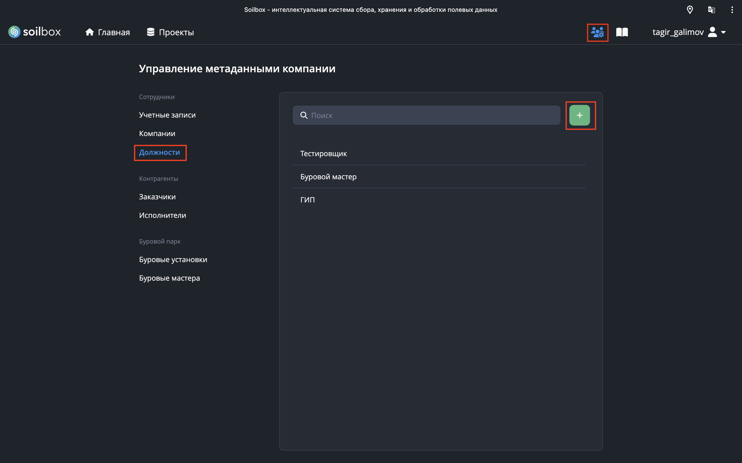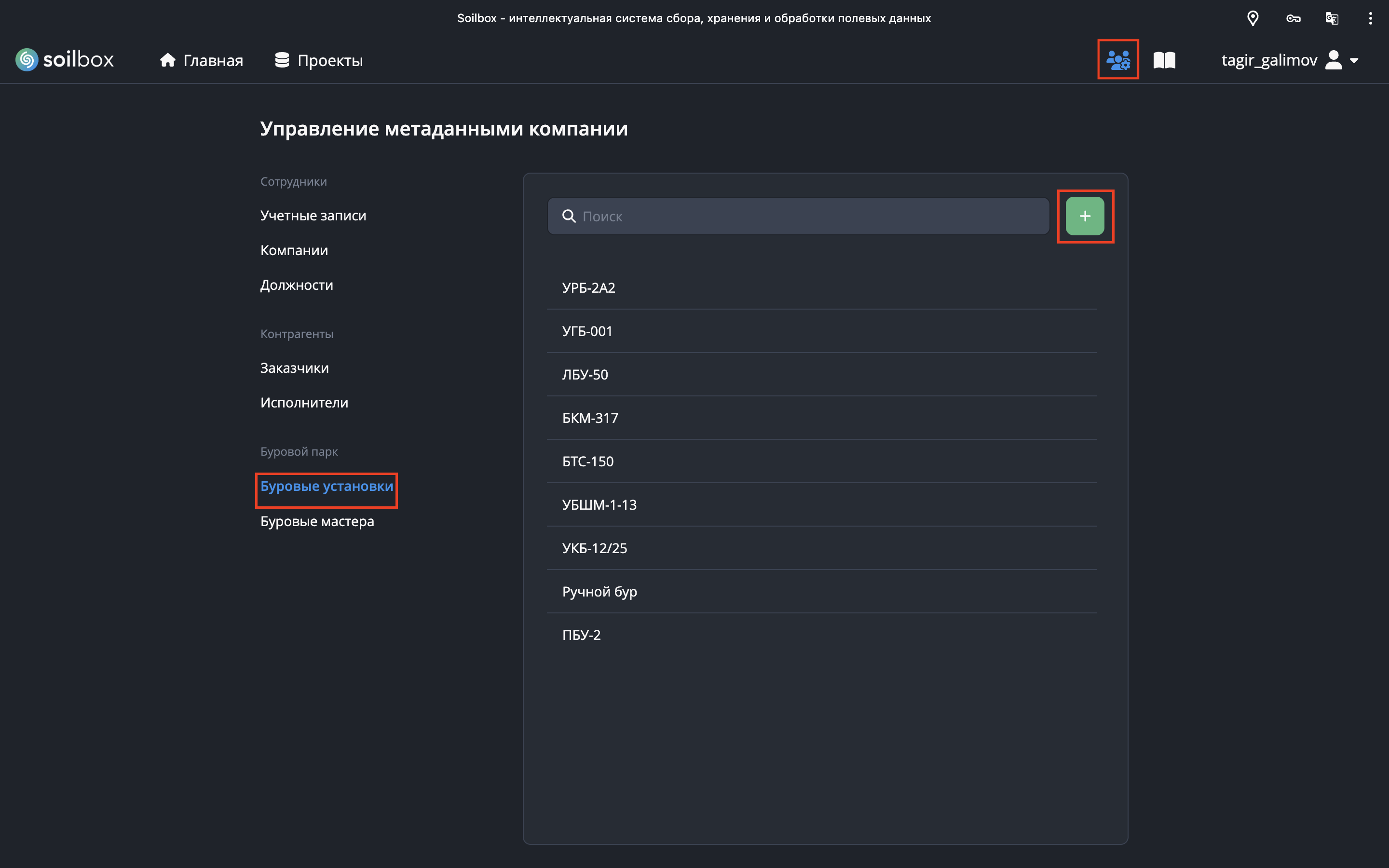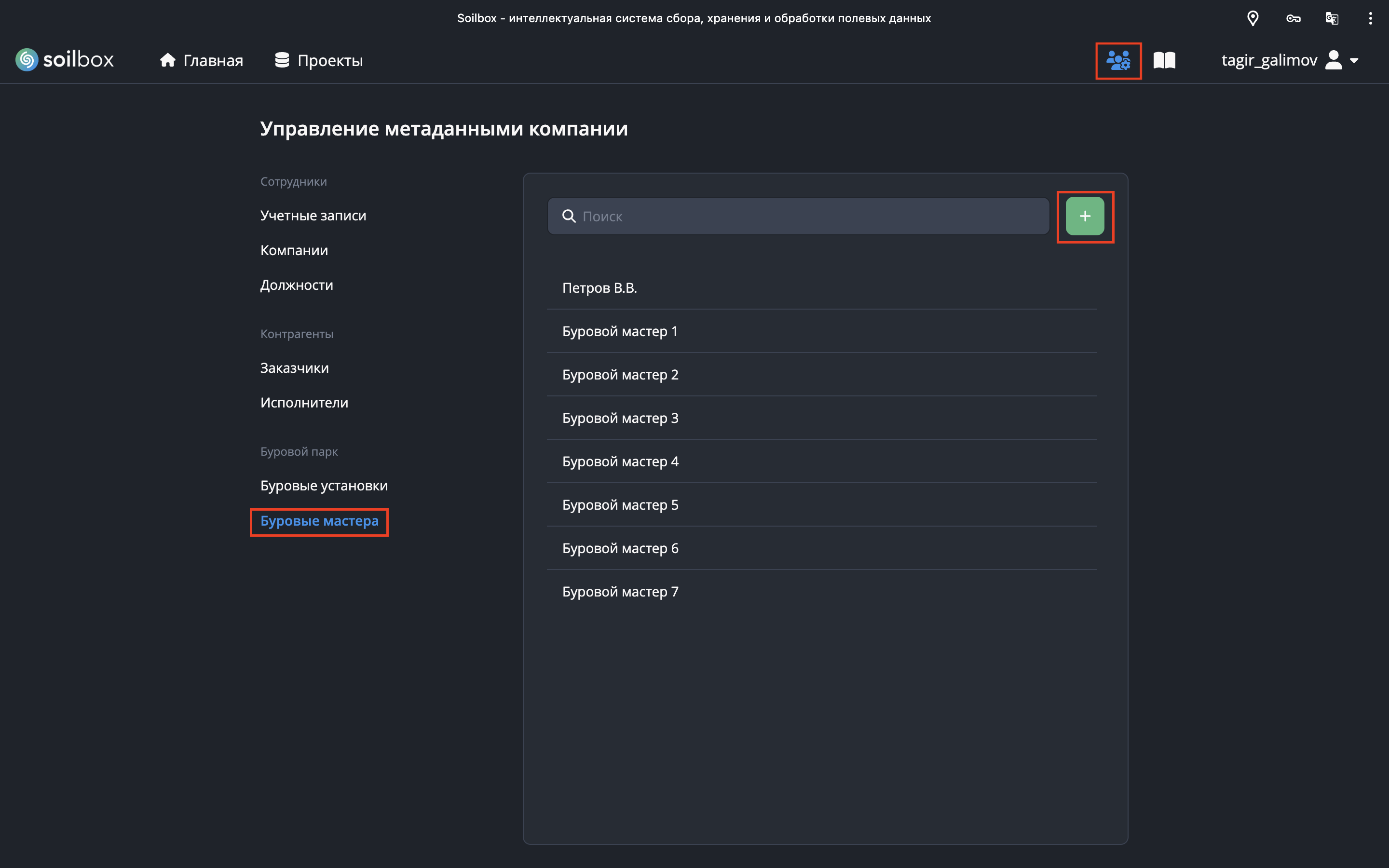 - Список буровых мастеров находится в разделе “Управление метаданными” в правом верхнем углу экрана. Нажимаем на строку “Буровые мастера” для перехода в раздел. Для добавления нового мастера нажимаем кнопку “+”.