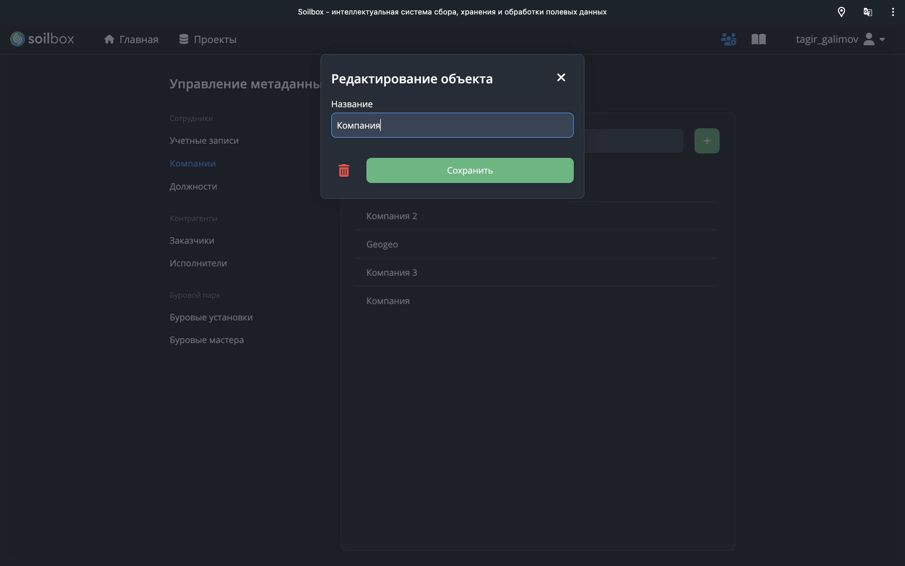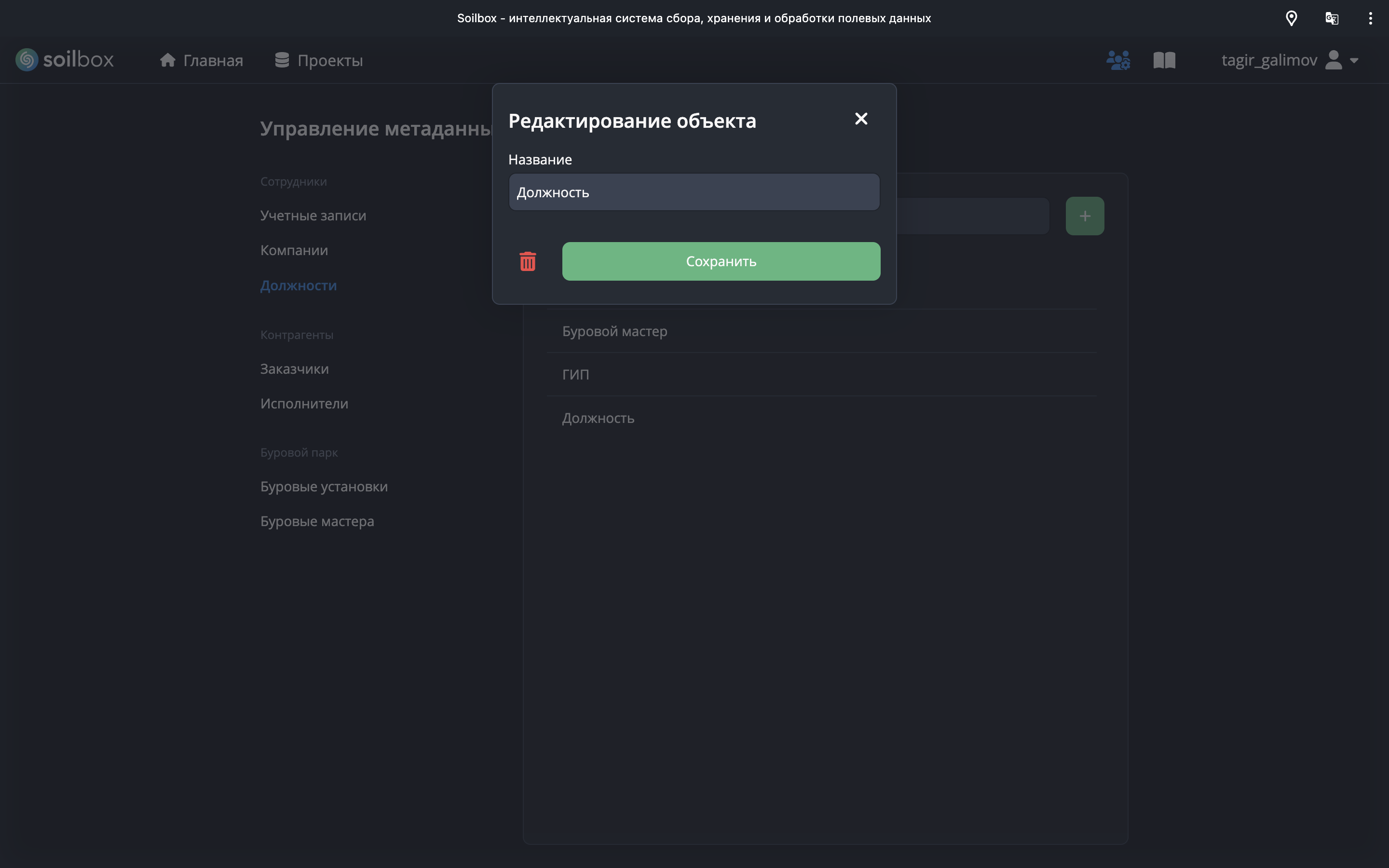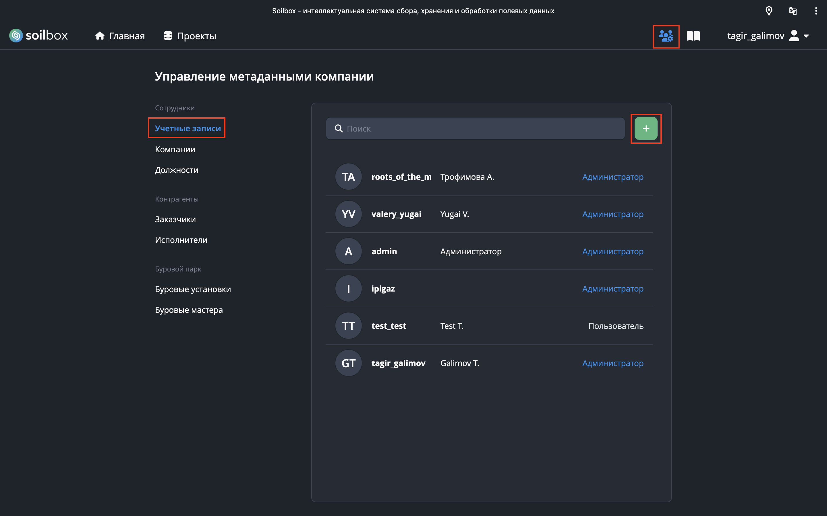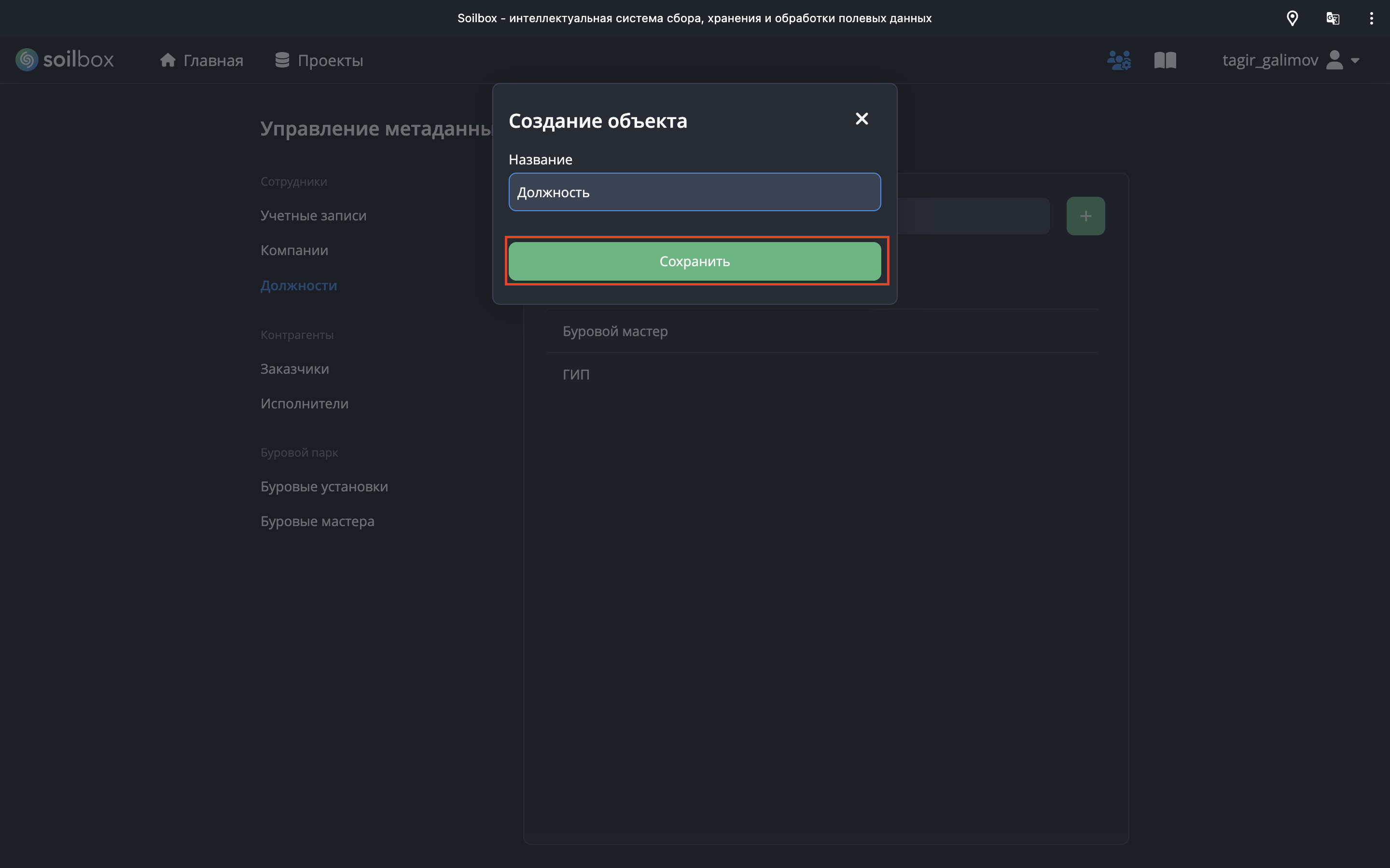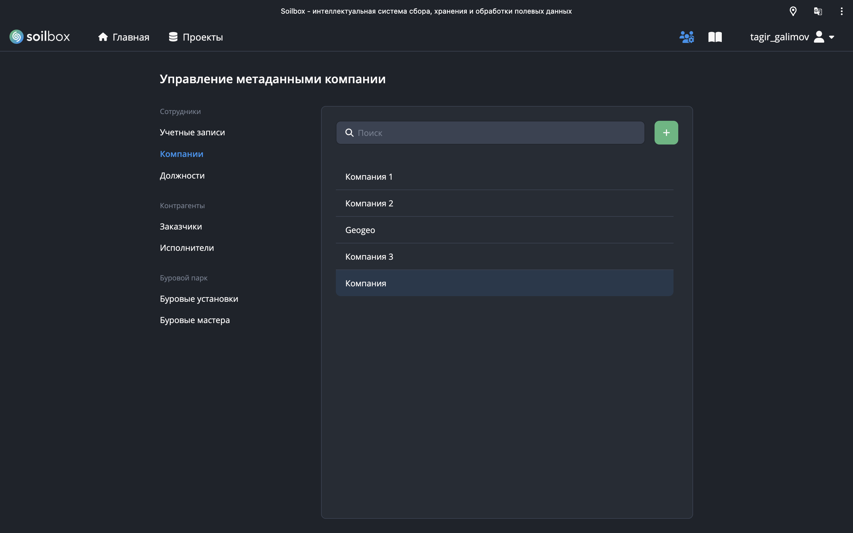 - Список буровых мастеров находится в разделе “Управление метаданными” в правом верхнем углу экрана. Нажимаем на строку “Буровые мастера” для перехода в раздел. Для добавления нового мастера нажимаем кнопку “+”.