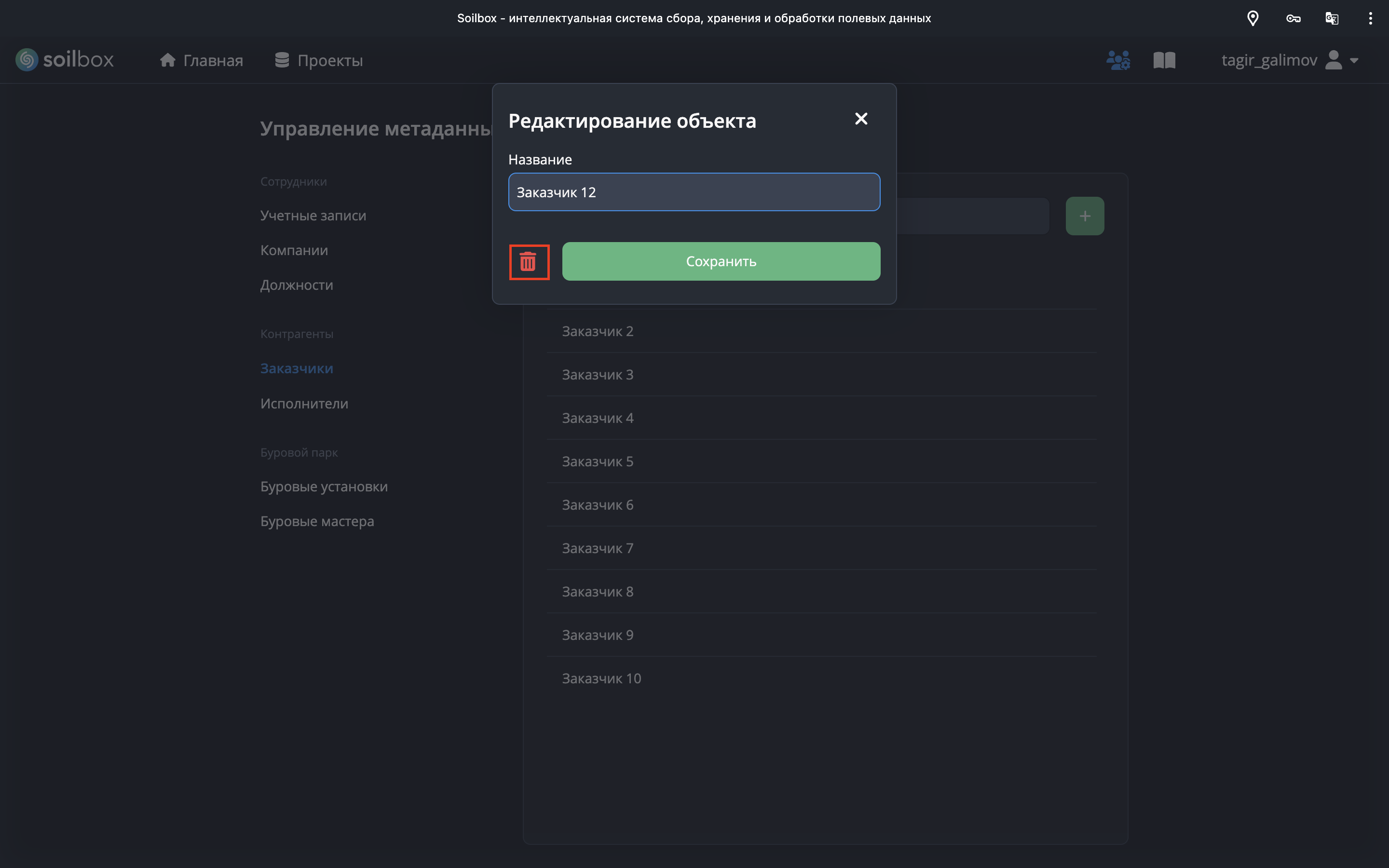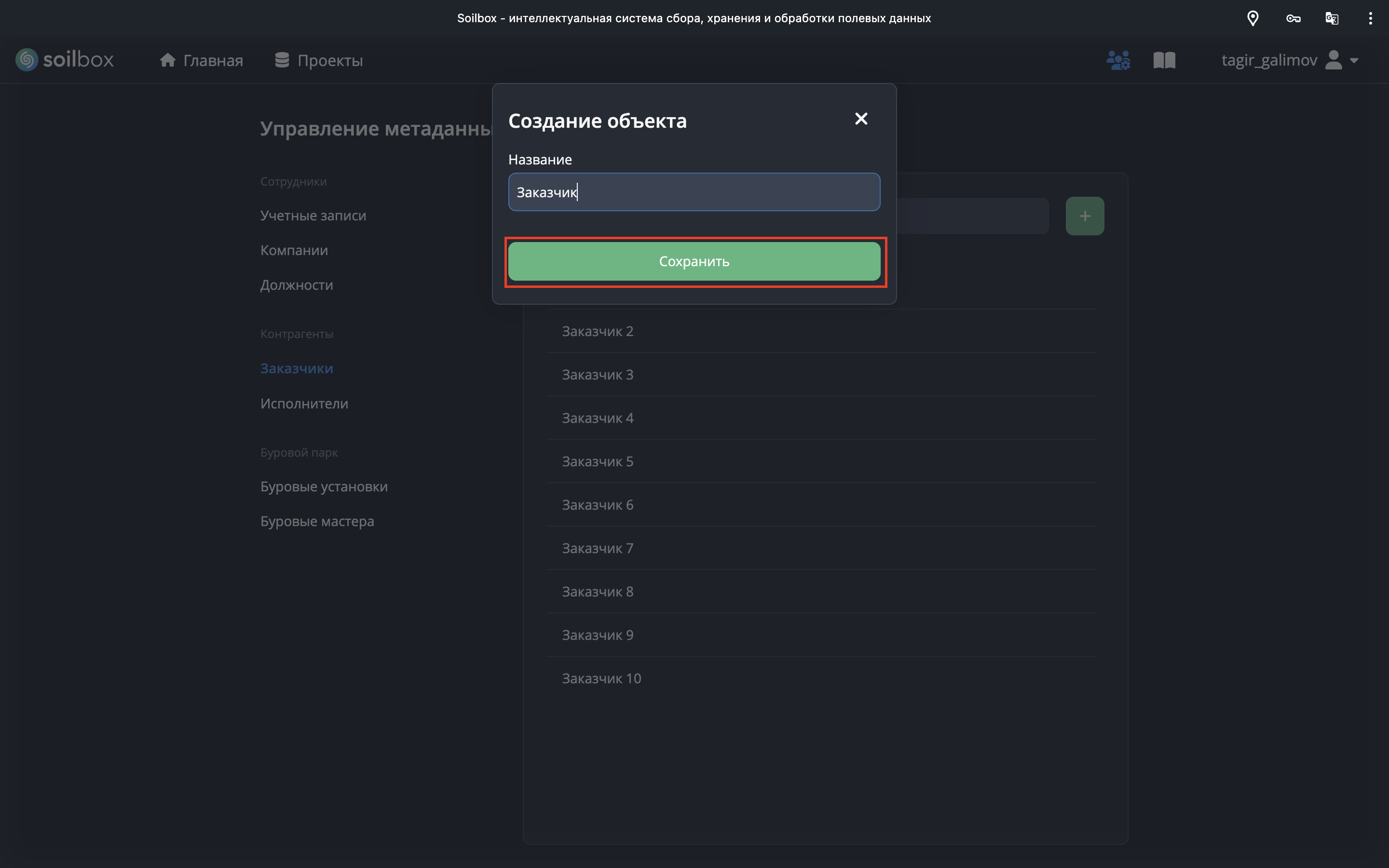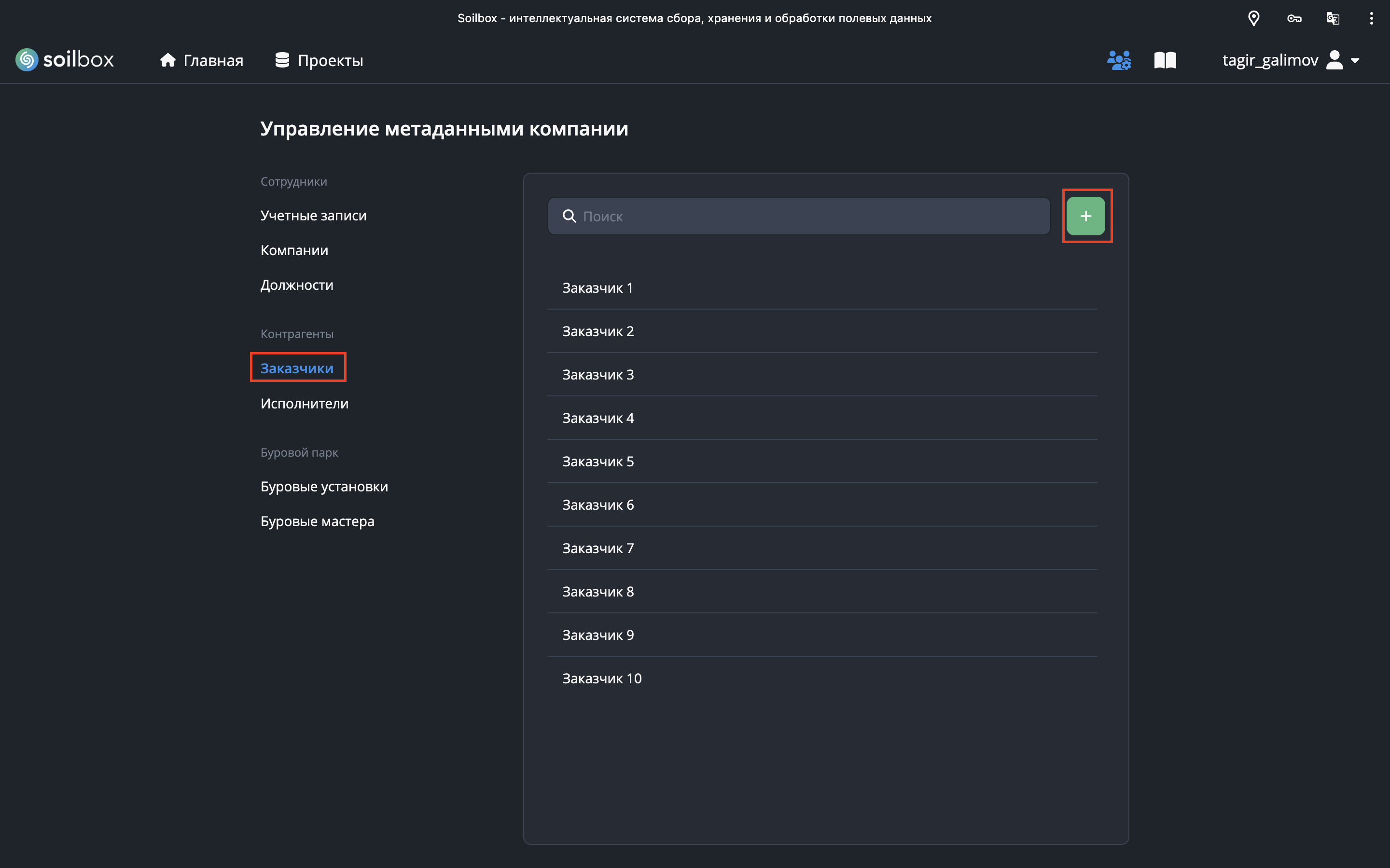 - Список Заказчиков находится в разделе “Управление метаданными” в правом верхнем углу экрана. Нажимаем на строку “Заказчики” для перехода в раздел. Для добавления нового заказчика в словарь нажмите кнопку “+”.