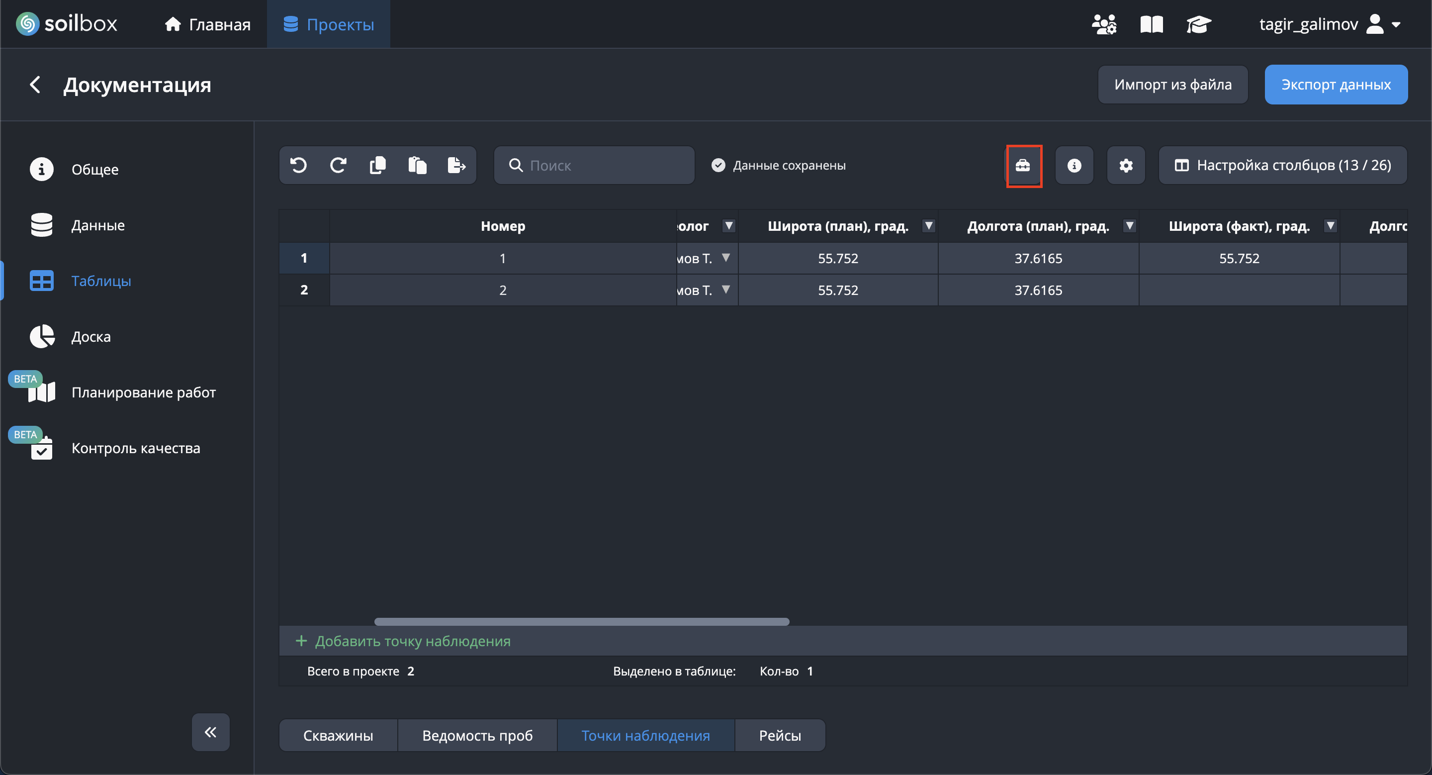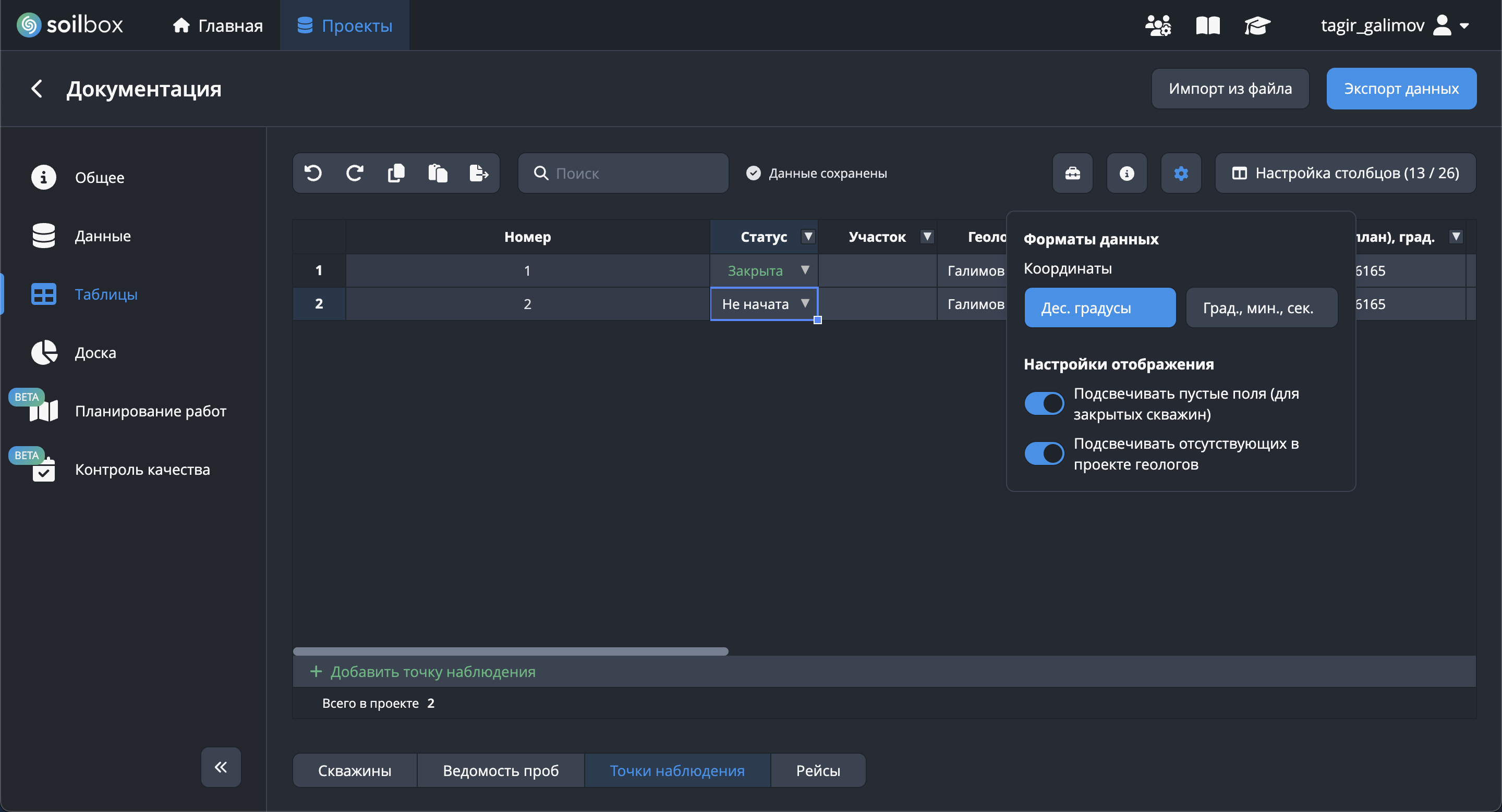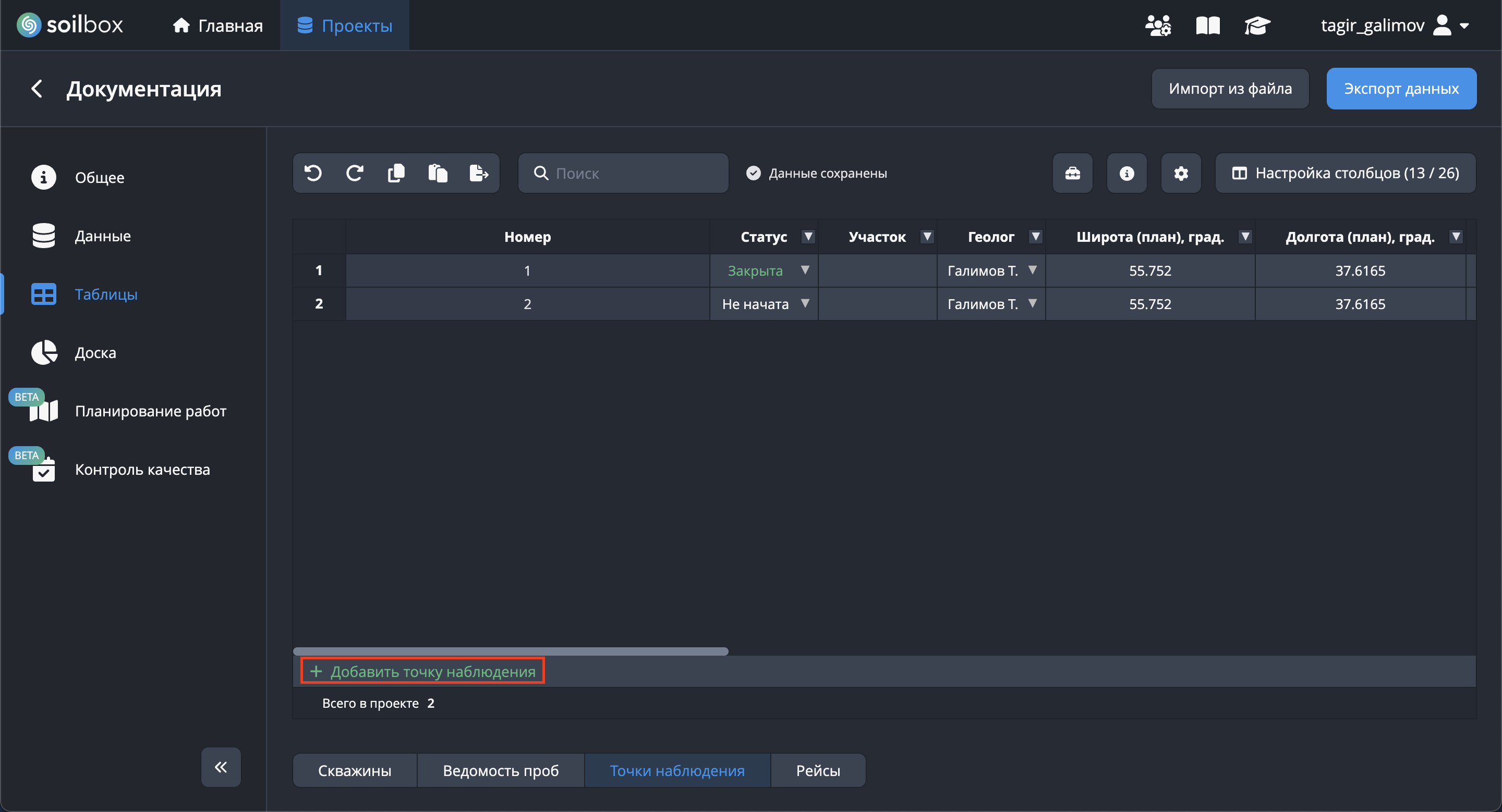 Раздел «Точки наблюдения» предназначен для работы с наблюдательными точками, добавленными в проект. Каждая строка таблицы соответствует отдельной точке, а каждый столбец — её параметрам: номер, статус, участок, геолог, координаты и другие атрибуты. Внизу таблицы отображается сводка по проекту (количество точек наблюдения).