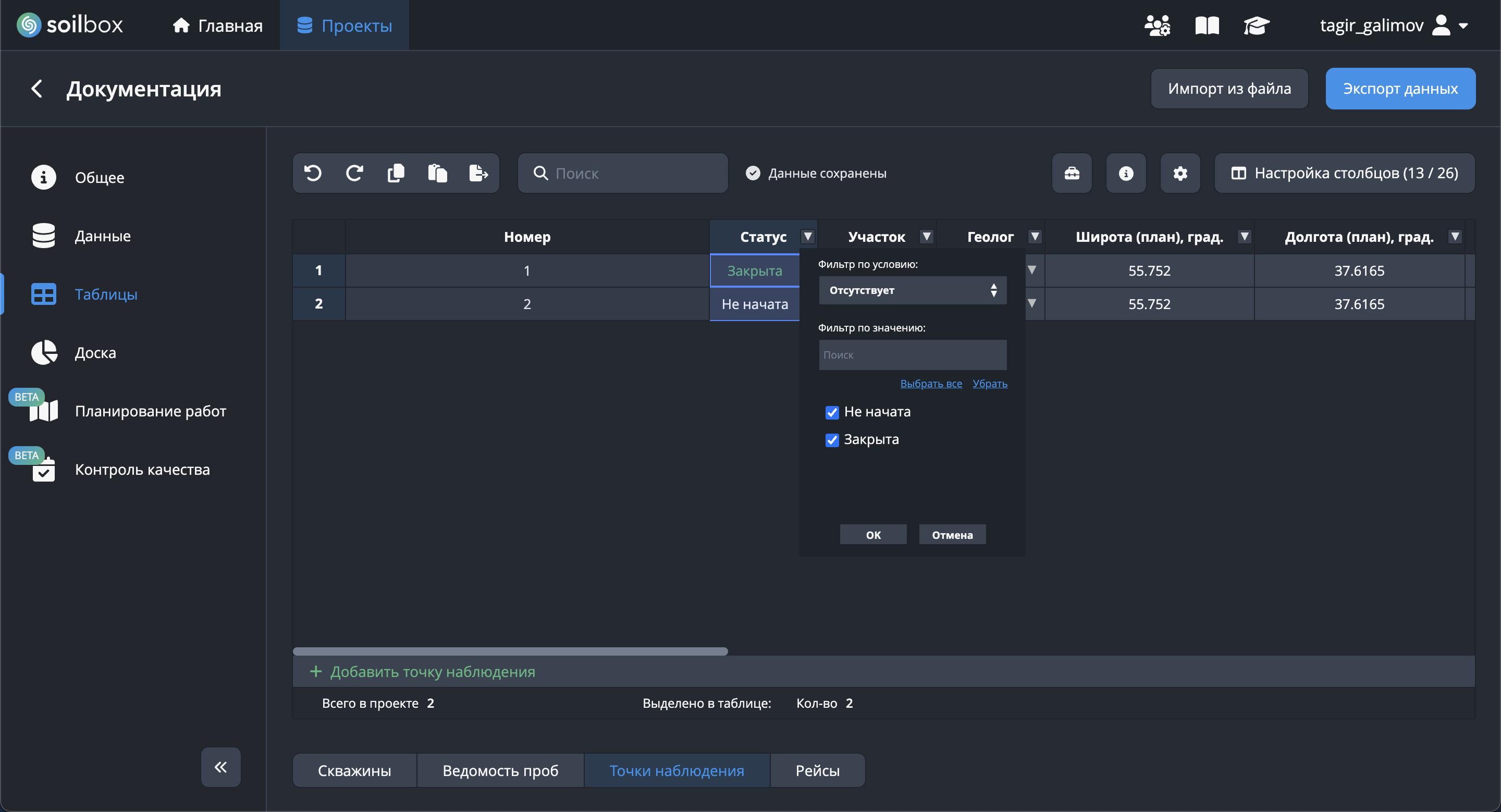 - Отметьте нужные параметры (например: Статус, Участок, Геолог, Широта (план), Долгота (план)).