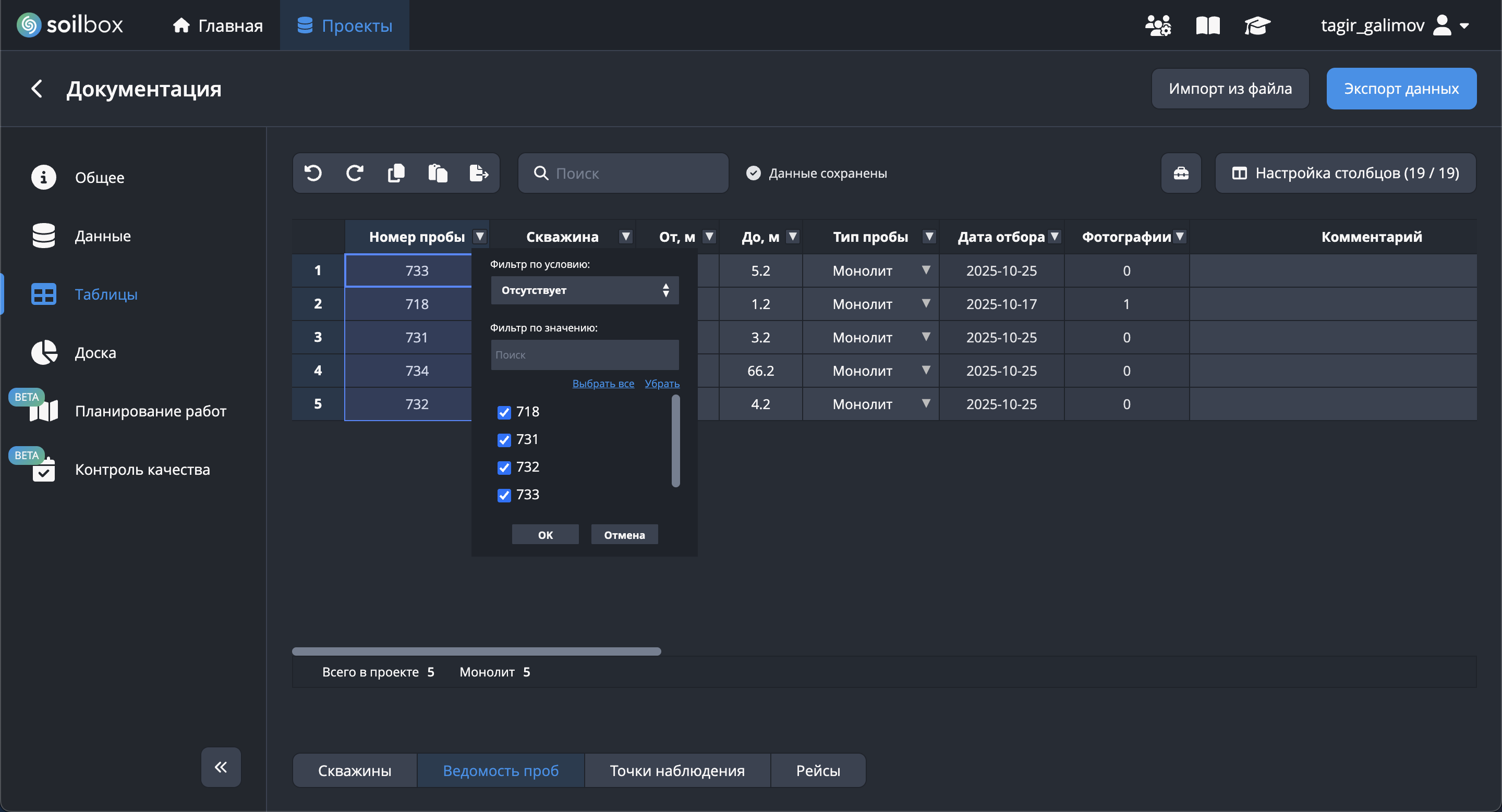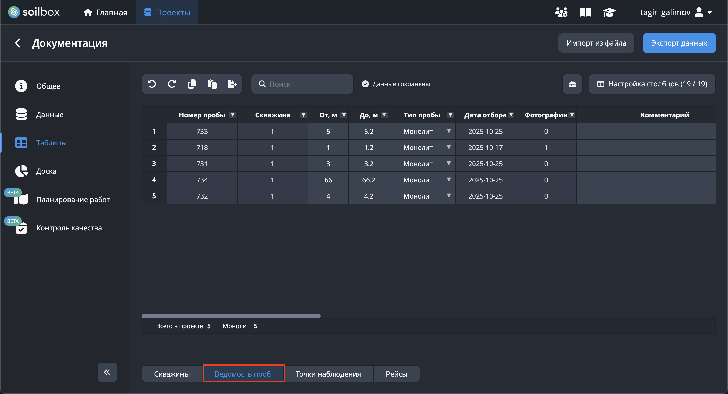 Раздел «Ведомость проб» предназначен для работы с информацией по всем пробам, отобранным в проекте. Каждая строка таблицы соответствует отдельной пробе, а каждый столбец — её параметру: номер, скважина, интервал отбора, тип, дата, фотографии, комментарий, полное описание, сокращенное описание, состояние, состояние мерзлого грунта, консистенция/водонасыщение, льдистость, плотность, содержание ов, карбонатность, ожелезненность.