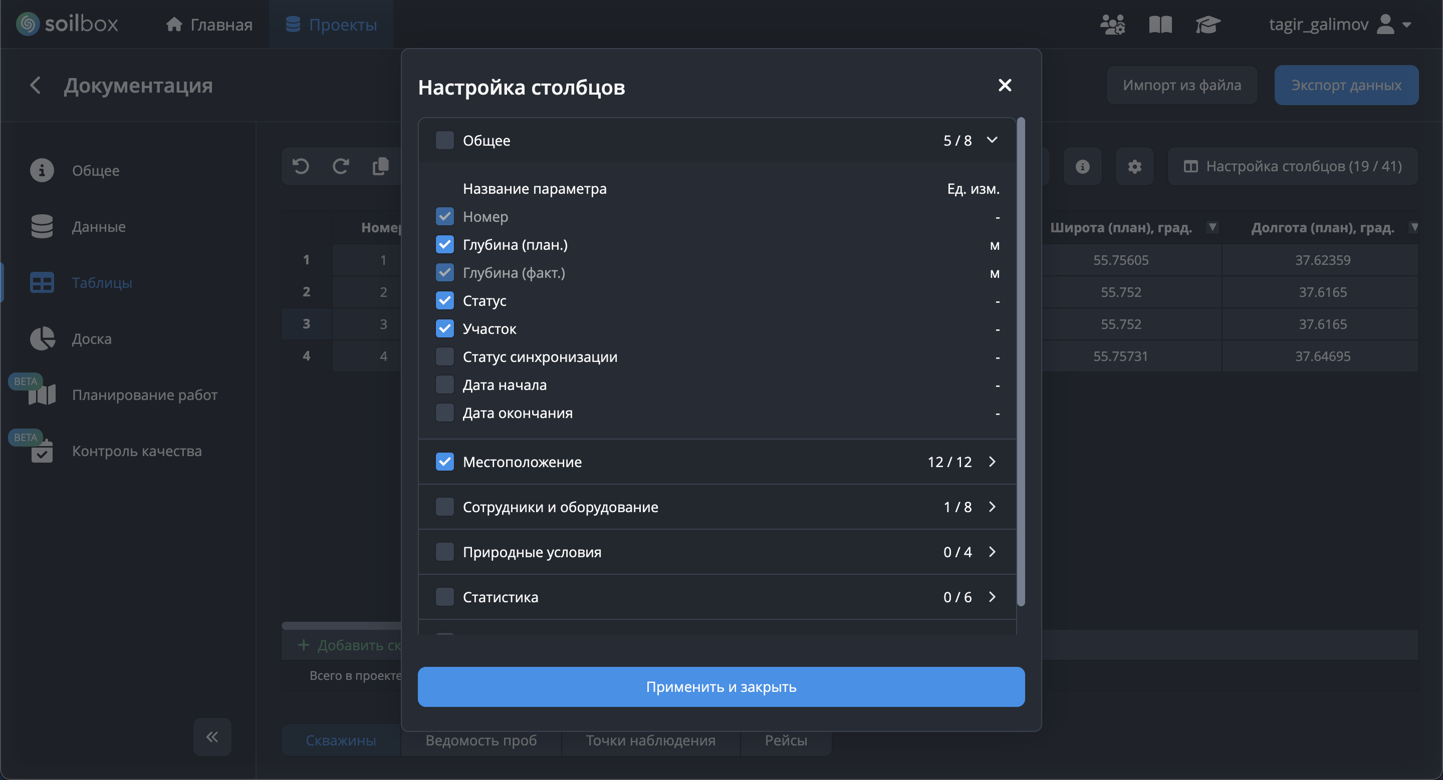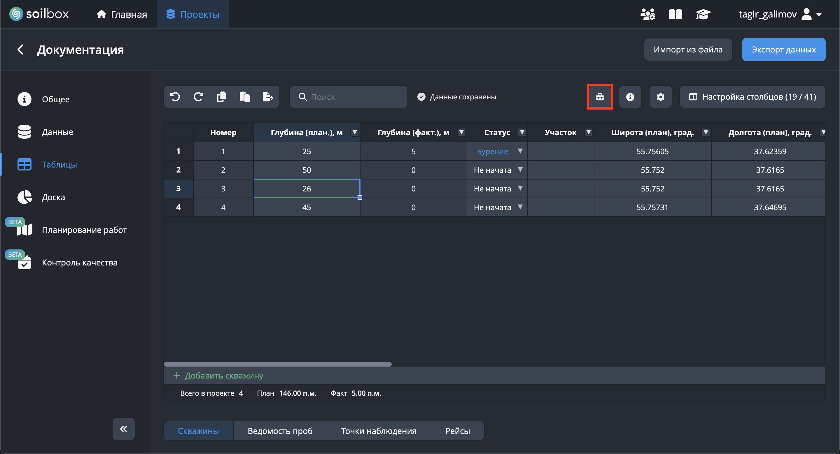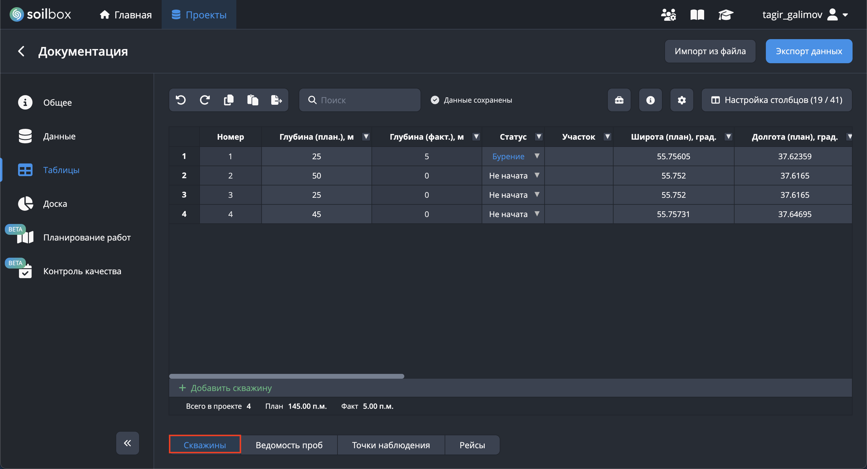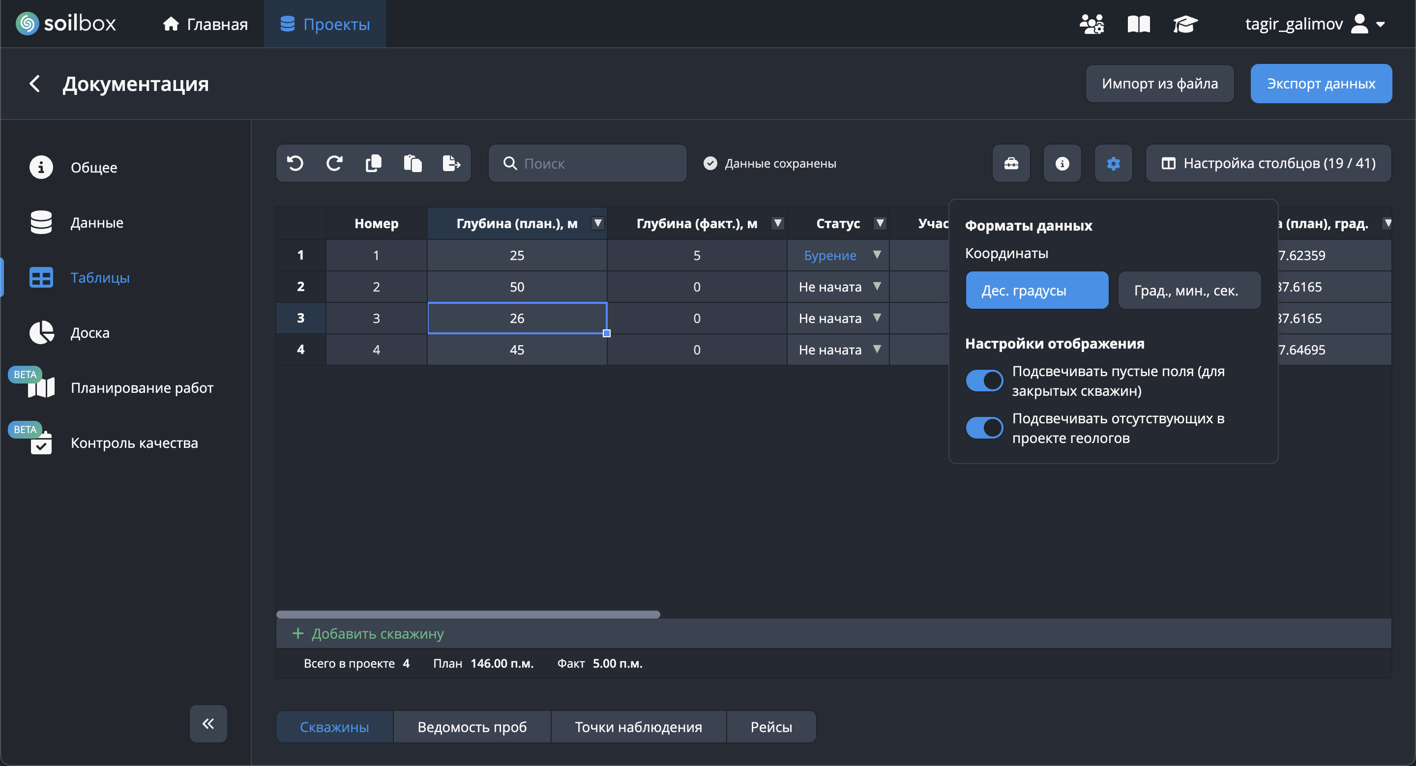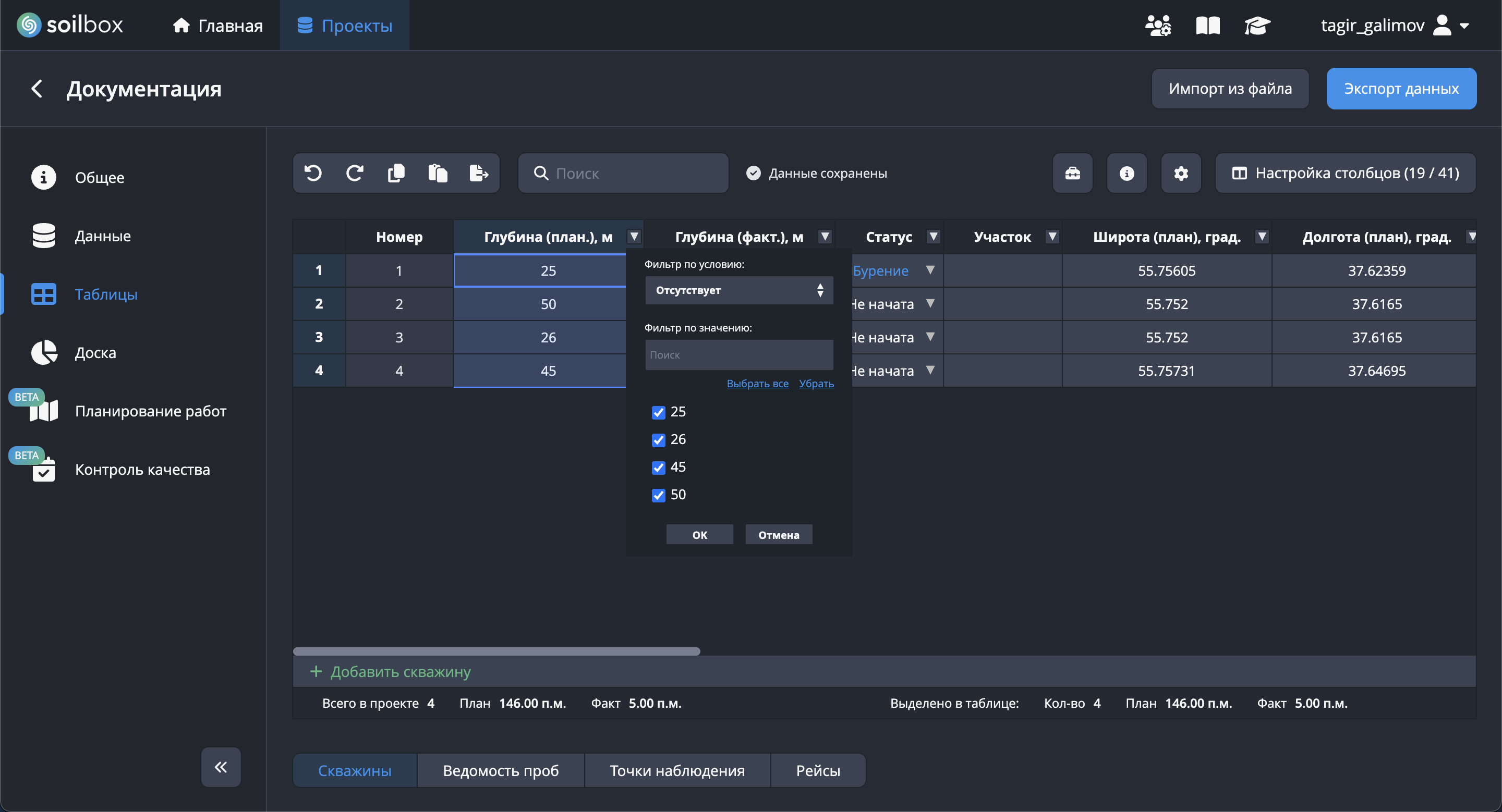 «Таблицы» предназначены для получения аналитических срезов и сводных данных по атрибутам всех типов сущностей Soilbox, входящих в проекты. Администраторы могут также использовать «Таблицы» для пакетного редактирования атрибутов (как в Excel) — например, назначения новых координат, однотипных заданий по скважинам, уточнение геоморфологических элементов точек и пр.